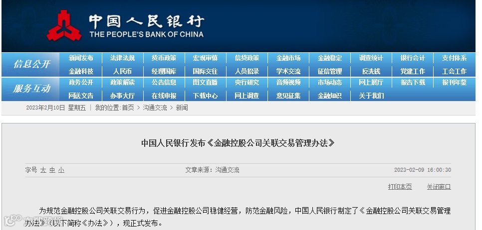 2023年2月10日,中国人民银行宣布为规范金融控股公司关联交易行为,促进其稳健经营、防范金融风险,正式发布《金融控股公司关联交易管理办法》(以下简称《办法》),自2023年3月1日起施行[k]。