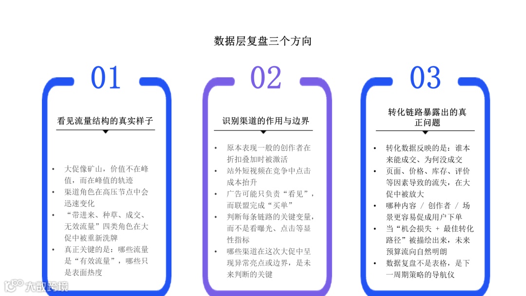 所以数据层复盘的核心,不只是看平台给了多少曝光、多少点击,