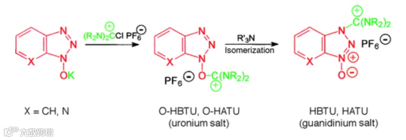 等人对这一问题进行了系统性研究,利用原始的三乙胺条件进行制备则得到主要是胍盐型HATU,后来改用KOAt盐制备则主要得到脲盐型HATU。在制备HATU的过程中,缩短反应时间和快速后处理可以主要得到脲盐型的HATU,KOAt和TCFH在DCM/H2O(15:1)溶液搅拌5到10分钟,后处理得到脲盐型HATU的产率达到78.9%。分别得到两种类型的HATU后,通过一些缩合反应验证,发现脲盐型HATU的反应活性明显优于胍盐型HATU,但是脲盐型HATU在叔胺存在下可以异构化为胍盐型HATU。【