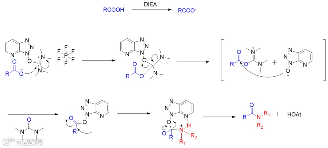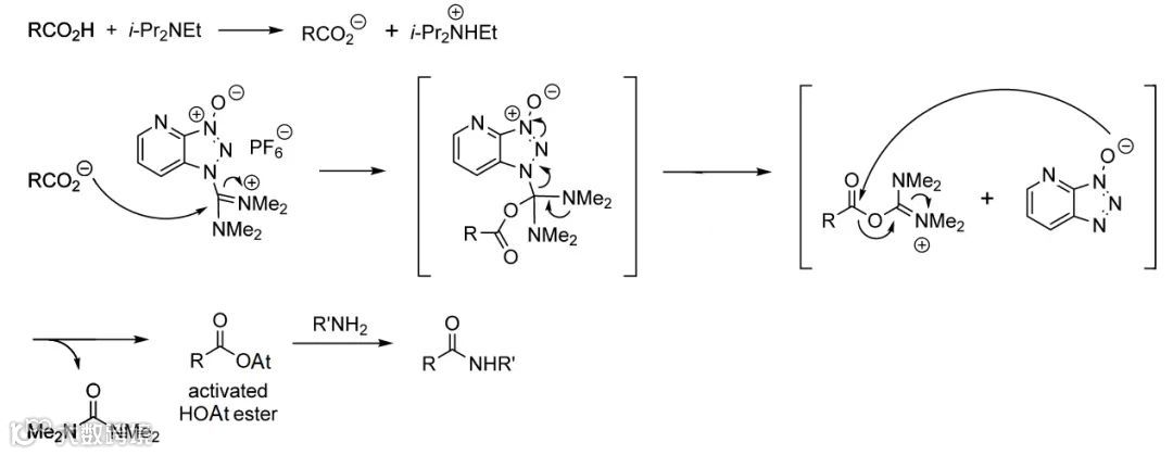 首先羧酸和有机碱反应得到羧基负离子,进攻HATU,加成-消除生成成不稳定的O-酰基(四甲基)异脲盐中间体。OAt负离子迅速攻击异脲盐,得到HOAt活性酯和四甲基脲。胺和HOAt活性酯再进行一次