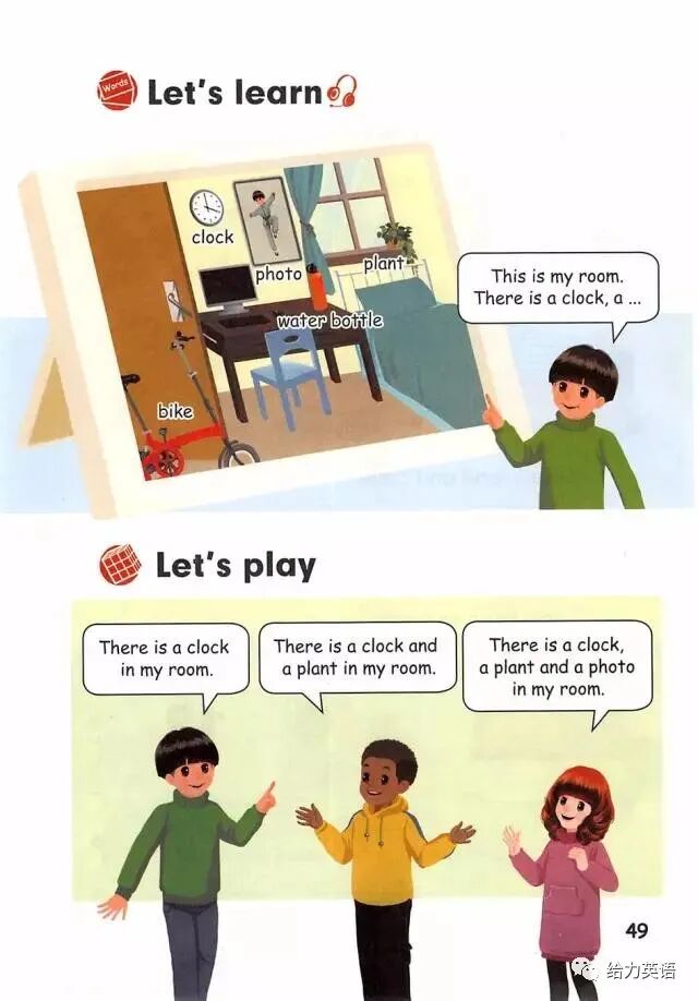 我的房间里有一面挂钟、一盆植物和一张相片。