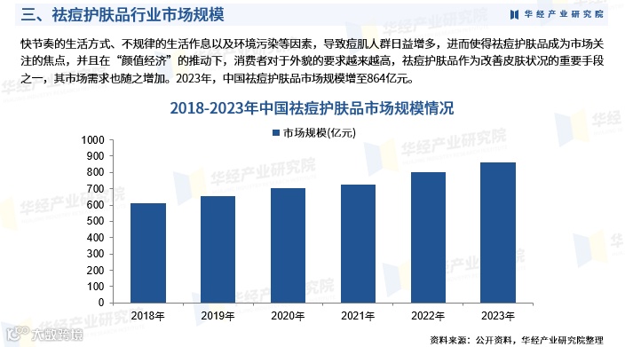 作为护肤品细分领域,祛痘产品受益于整体行业的技术进步与消费需求升级。随着“颜值经济”兴起,消费者对皮肤健康关注度提升,叠加快节奏生活、作息不规律及环境污染等因素影响,痘肌人群持续扩大,推动祛痘护肤品市场需求增长。2022年中国护肤品市场规模达2762.67亿元,2023年祛痘护肤品市场规模已增至864亿元。