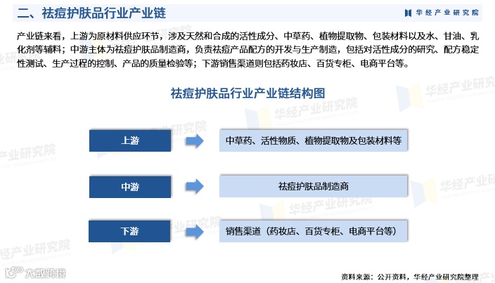 行业上游主要包括活性成分(天然或合成)、中草药提取物、植物提取物及包装材料、水、甘油、乳化剂等辅料供应;中游为祛痘护肤品制造商,负责配方研发、生产制造、质量检测等环节;下游销售渠道覆盖药妆店、百货专柜及电商平台等多元通路。