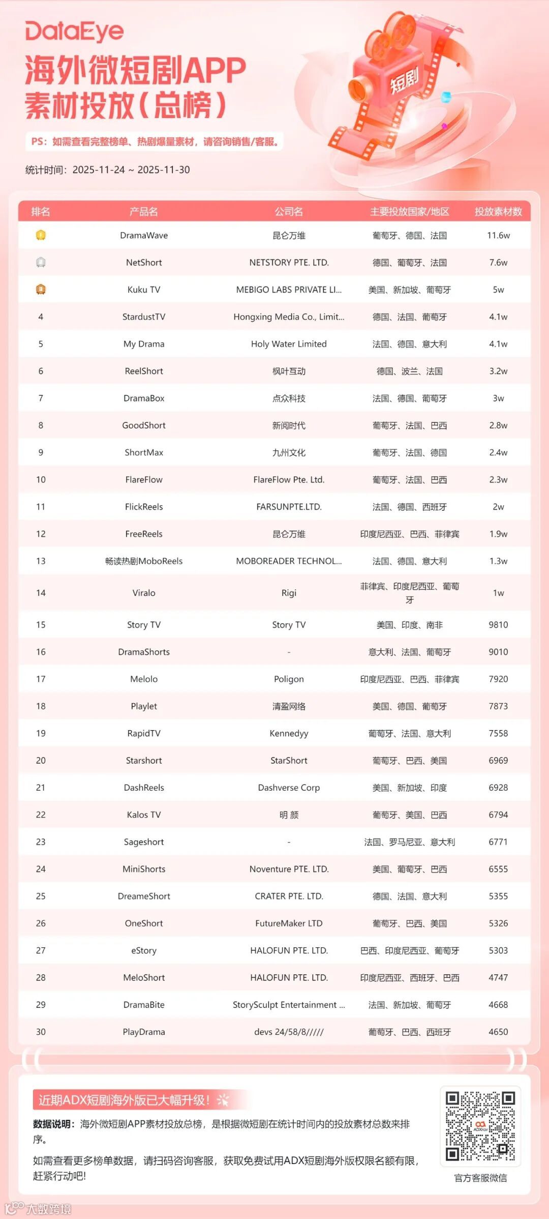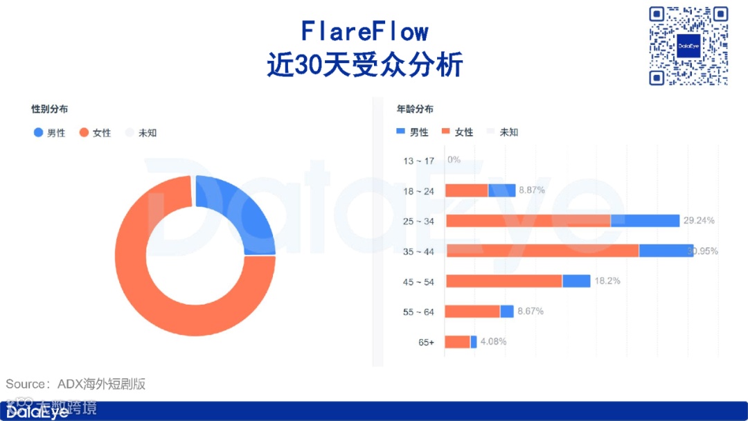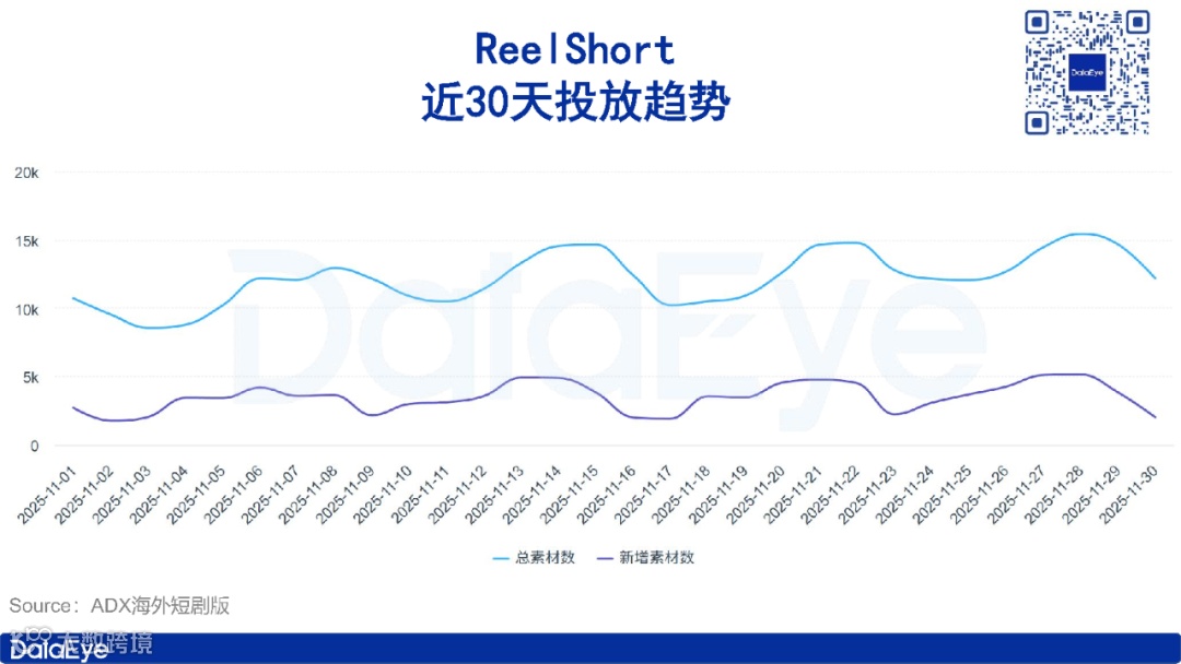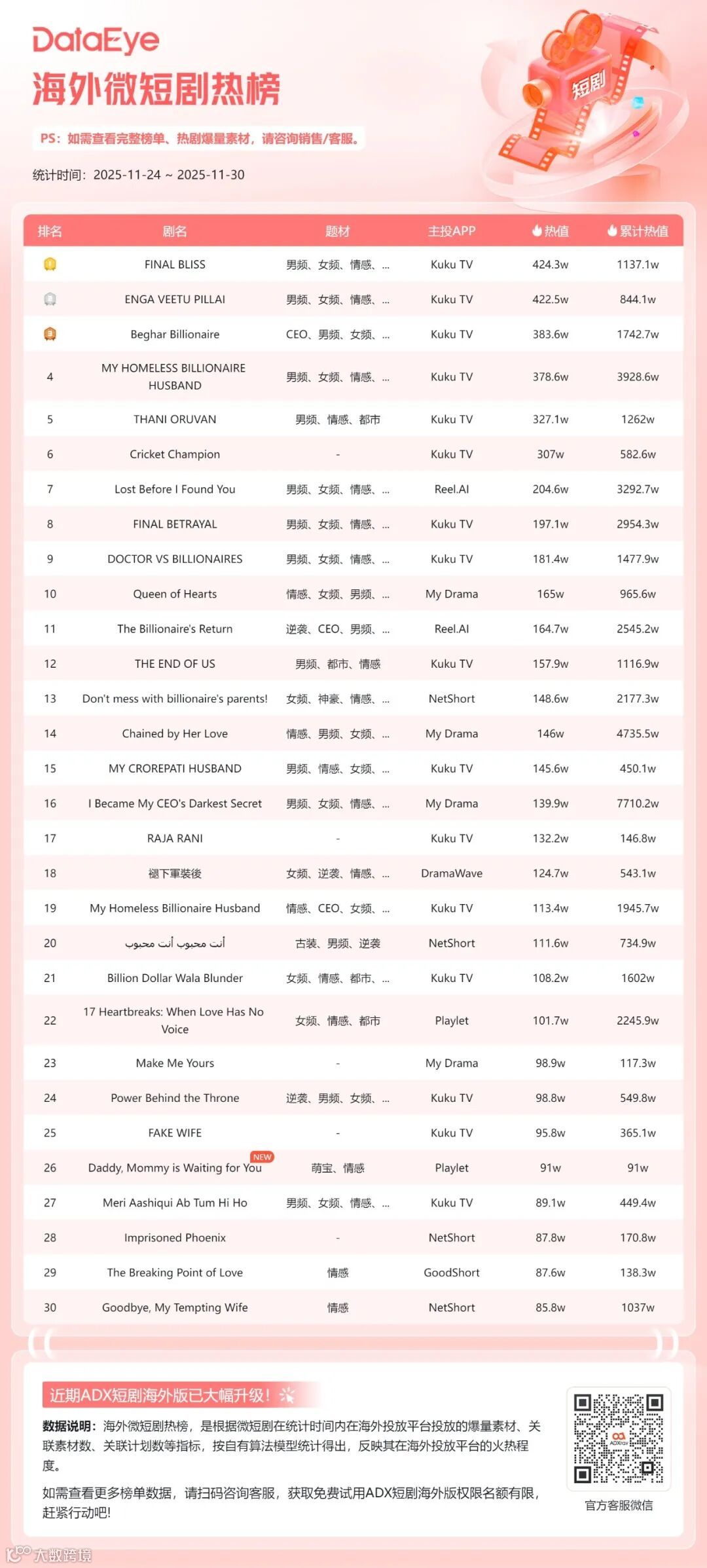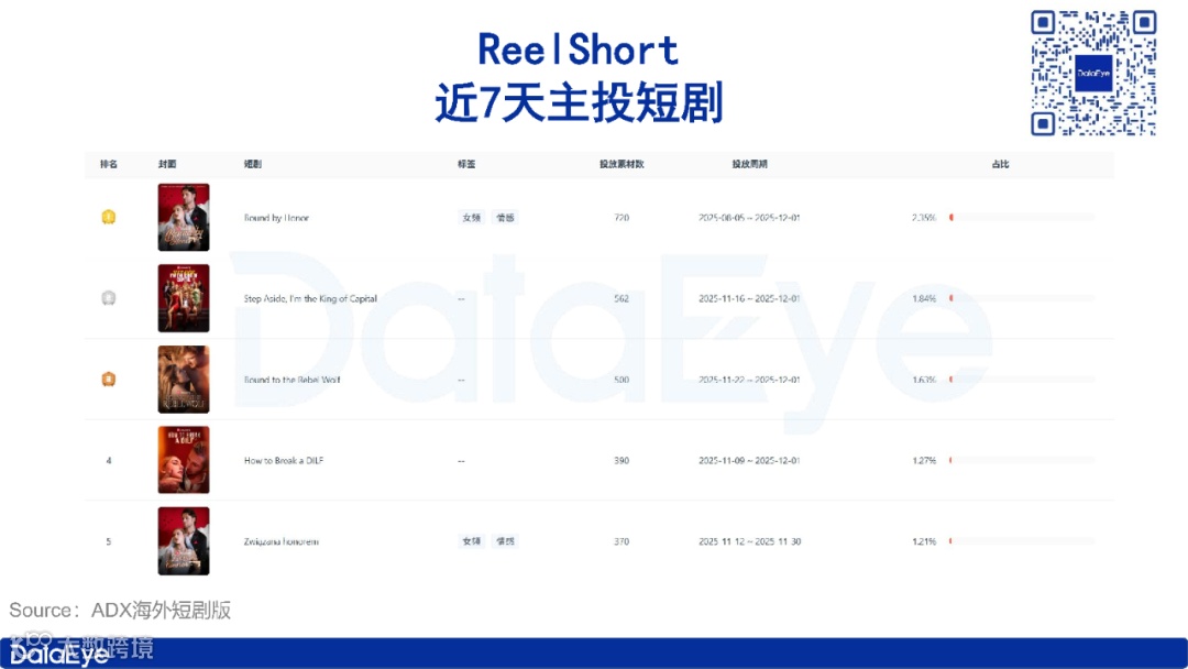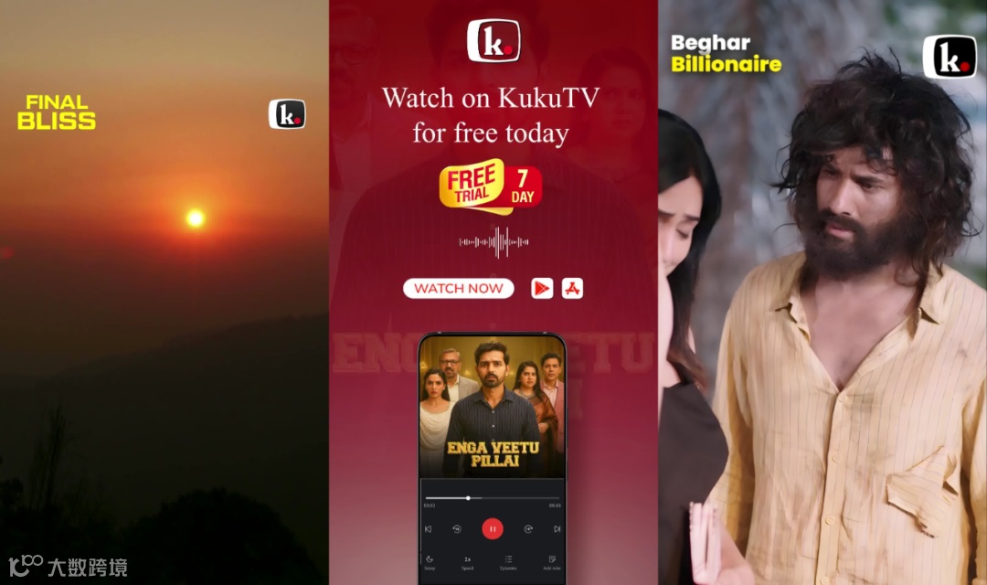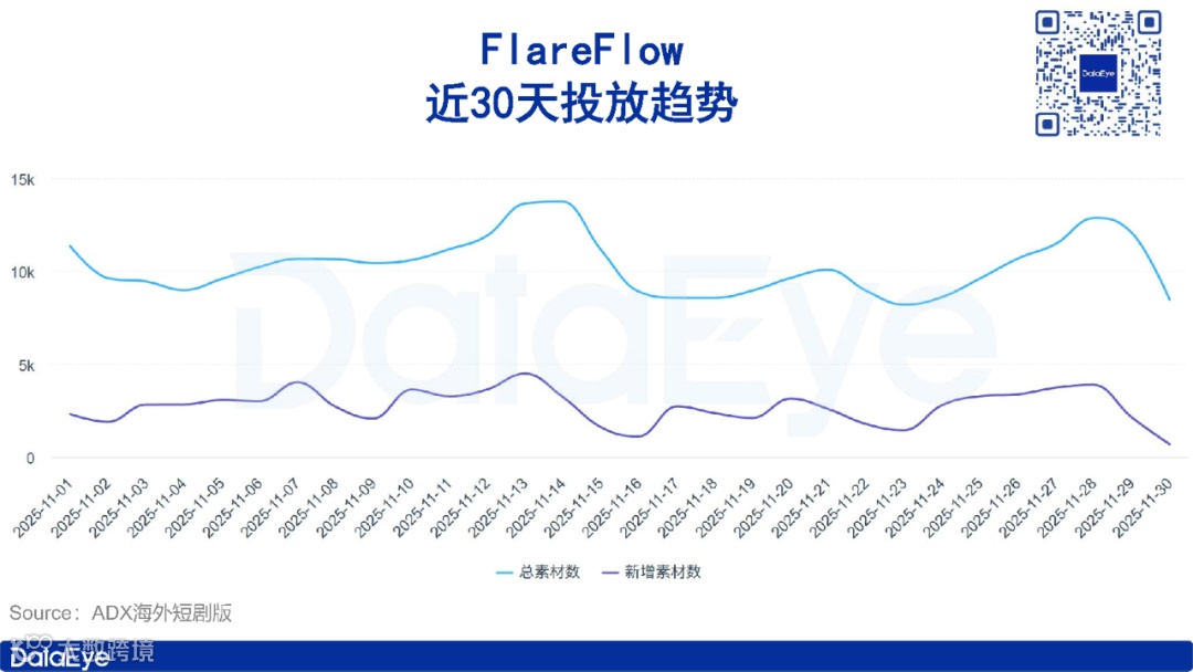 关注我们↓第一时间发布相关推文!一、DataEye海外微短剧热榜本期(11月24日-11月30日)DataEye海外微短剧热榜,《FINAL BLISS》位列榜首,热值424.3万;《ENGA VEETU PILLAI》位列第二,热值422.5万;《Beghar Billionaire》位列第三,热值383.6万。本期DataEye海外微短剧热榜中,TOP30微短剧热值5320.6万,较上期减少了1.01%。从热值来看,本期DataEye海外微短剧热榜中,共有22部微短剧热值超100万,较上期减少了4部,热值超200万的有7部,较上期减少了2部。本期仅有1部新剧上榜,该剧名为《Daddy, Mommy is Waiting for You》,位列第26位,热值91万,是一部融合了“带球跑”和“追妻”元素的短剧,讲述了七年前女主得知男主竟是黑手党继承人,且拒绝离婚筹款来进行手术因此设计假死逃离,如今女主身患重病携女儿回归,男主却未认出对方身份,进而引发后续追悔与救赎的故事。从译制剧数量来看,本期DataEye海外微短剧热榜中,译制剧数量为1部,较上期减少2席,本土剧则占据29席。从热值来看,《埋葬父母后,再也不原谅》译制剧《褪下軍裝後》位列第18位,热值124.7万。从投放产品平台来看,Kuku TV、My Drama和NetShort表现活跃。本期DataEye海外微短剧热榜中,Kuku TV占据16席,My Drama和NetShort各占据4席。另外,值得注意的是My Drama平台的爆款剧《I Became My CEO's Darkest Secret》在本周以7804组素材量登顶DataEye海外短剧排行榜,《金仙下凡,从治好哑巴妻子开始》译制剧《金仙在人間》滑落至第二位,素材量7210组。二、海外微短剧APP素材投放总榜本期(11月24日-11月30日)DataEye海外微短剧APP素材投放榜,DramaWave蝉联榜首,素材量11.6万组;NetShort位列第二,素材量7.6万组,Kuku TV位列第三,素材量5万组。本期海外微短剧APP素材投放总榜中,TOP30 APP的素材投放总量达63.2万组,较上期减少了0.88%。其中榜首DramaWave投放素材量达11.6万组,大幅领先榜单。具体来看,本期海外微短剧APP素材投放总榜中,共有14款产品素材数破万组,与上期持平。从投放媒体来看,本期海外微短剧APP素材投放总榜TOP30的产品主投Facebook、Instagram、FacebookAudience和Messenger。其中13款产品主投Facebook,12款产品主投Instagram,3款产品主投FacebookAudience,2款产品主投Messenger。本期ReelShort表现亮眼,在头部产品素材量大多微弱下滑的同时,ReelShort素材量迎来较大增长,达3.2万组,位列第6位。本期要关注的案例便是ReelShort,ADX海外短剧版数据显示,近30天,ReelShort投放素材量呈震荡上行趋势,日投放素材量由最初的1万组左右,上涨至上周最高超1.5万组。11月28日,ReelShort投放素材量达近30天最高点15443组。从投放微短剧数据来看,ReelShort投放微短剧呈现出以本土剧为主的状态。近7天,ReelShort共投放1196部短剧,TOP 10均为本土剧。其中《Bound by Honor》投放素材量最高,占比2.35%,《Step Aside, I'm the King of Capital》和《Bound to the Rebel Wolf》紧随其后,素材量占比分别为1.84%和1.63%。三、海外微短剧APP素材投放增长榜本期(11月24日-11月30日)DataEye海外微短剧APP素材投放增长榜,ReelShort登顶,FlareFlow位列第二,ShortMax位列第三。本期DataEye海外微短剧APP素材增长榜中,TOP20 APP的增量总数为29539组,较上期减少了43430组,环比下滑59.52%。具体来看,本期海外微短剧APP素材投放增长榜中,共10款产品素材增量超1000组,其中榜首ReelShort环比上期素材增长达4333组,位于第二、三名的FlareFlow和ShortMax环比上期增量分别为4267组和2618组。本期关注的案例是FlareFlow,作为中文在线旗下新海外短剧平台,FlareFlow自2025年4月28日开启投放至今,累计投放素材量23.7万(智能去重)。近30天,FlareFlow投放力度呈震荡走势,日投放素材量由最初的1万组左右至11月中旬上涨至最高超1.3万组,而后快速下滑,至11月底再度上涨至1.3万组左右。从受众分布来看,近30天,FlareFlow用户群体以女性为主,占比74.25%,男性用户占比24.94%。从年龄分布来看,青年用户为其主要受众群体,其中35-44岁用户占比最高,达30.95%,25-34岁紧随其后,占比29.24%,45-54岁用户占比18.2%。