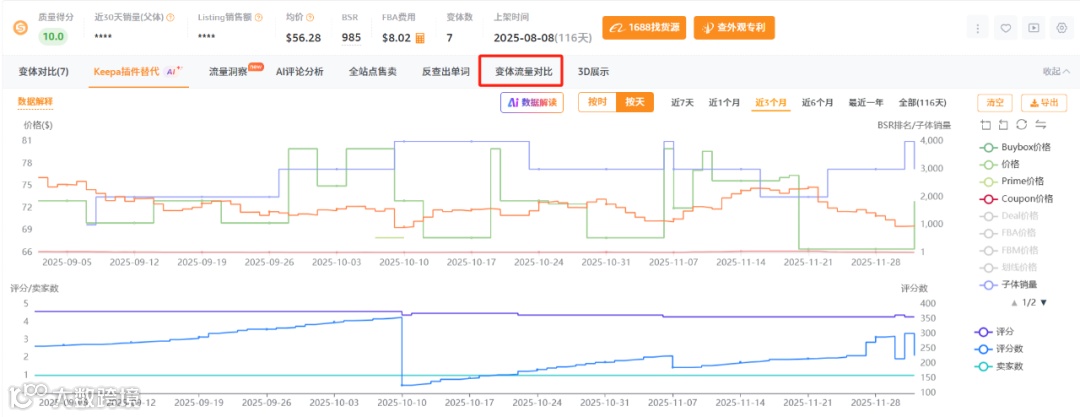 可通过卖家精灵插件,在Listing页面使用“变体流量对比”功能,查看该产品所覆盖的SP广告词、视频广告词、品牌广告词及HR推荐词数量。