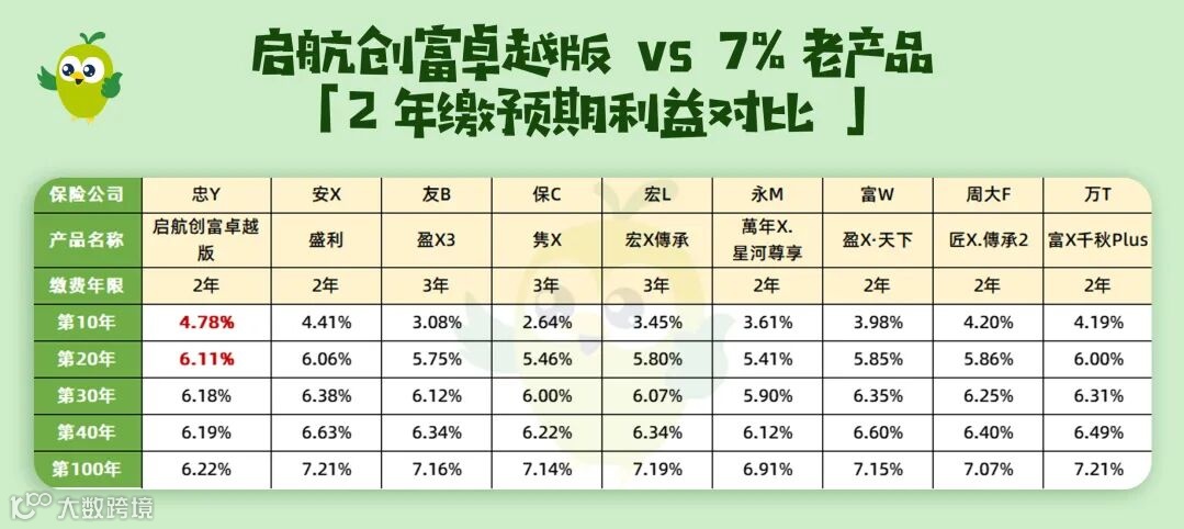 来看看对比数据:2年缴,保单前25年,IRR回报市场最高,盛利、富饶千秋只能勉强跟上;5年缴,保单前20年,IRR回报市场最高,只有宏挚传承、周大福匠心传承2勉强能跟上。但要注意,保单25年后收益逐渐被其他产品反超,尤其在长期持有或财富传承场景下不具备优势。比起那些要等100年才能拿到7%收益的产品,听起来美好却太遥远。但忠意启航创富卓越版不一样,20到30年就能收获可观收益,实实在在能落袋的钱才是真金白银!