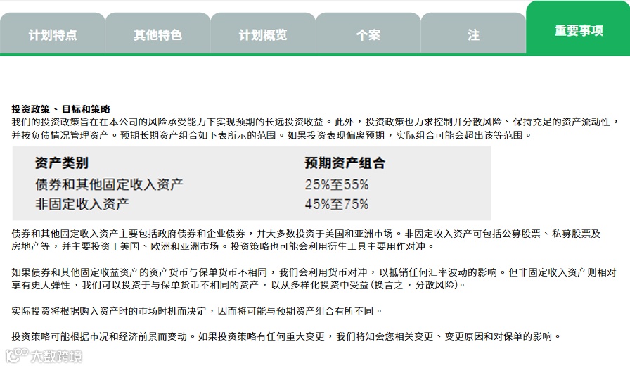 为什么忠意能实现这么高的中短期收益?秘密在于其稳健的投资策略。忠意启航创富卓越版的投资策略主打一个稳健,固定收入资金占比是20%到100%,股票类是0到80%,弹性非常大,属于很稳健的投资策略。和友邦万通这样的老牌稳健保司类似,而不是像保诚和宏利那么激进。