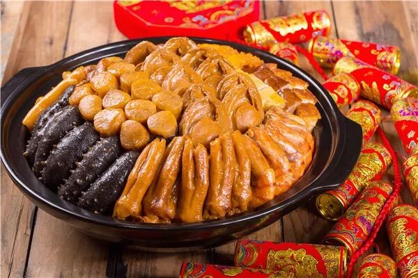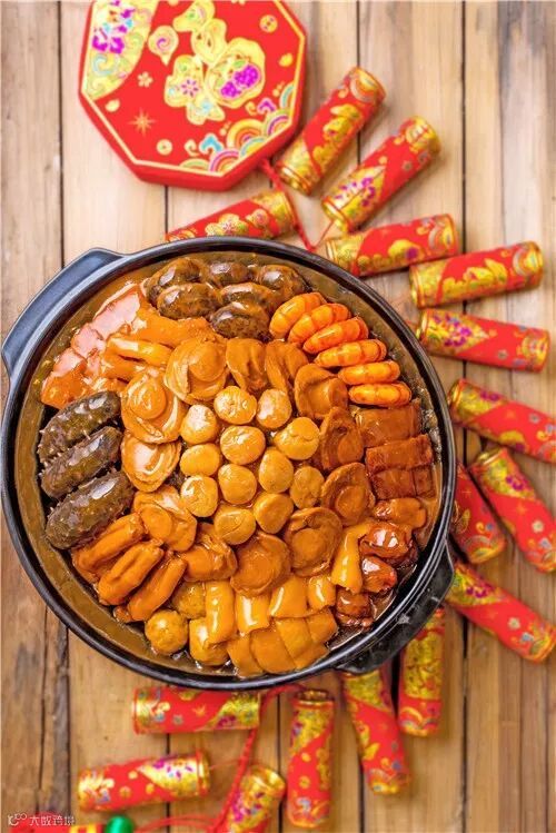 新年自然少不了盆菜的加入,四季发财盆菜是新好彩运集团精心创立的上等食材盆菜,分为精装盆菜(6位用)和金装盆菜(12位用),精心使用各种名贵食材,鲍鱼、花胶、瑶柱、鹅掌、辽参等,一层层叠进大盘之中,层层吃下去,汁液交融,味道馥郁而香浓,令人回味无穷。