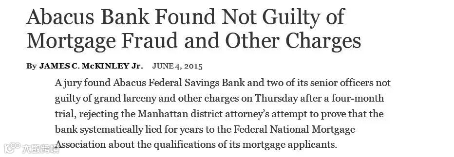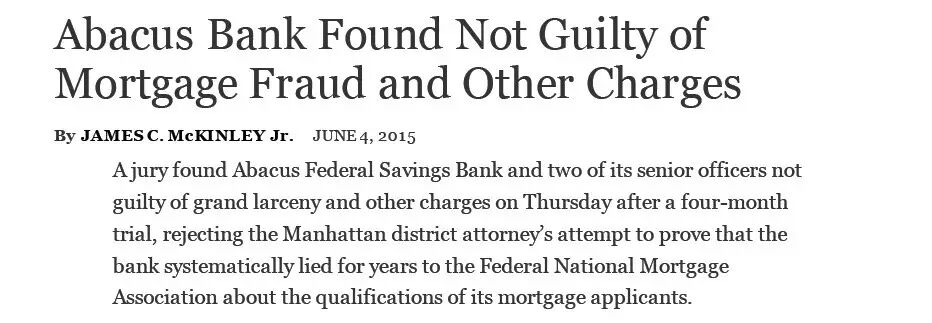 Abacus Bank及其雇员被指控教唆并协助客户虚假陈述贷款申请人资质(即夸大收入水平、个人实有资产及工作头衔)以满足房利美的贷款担保要求。曼哈顿地区检察官Cyrus R. Vance Jr. 指出,检方根据某位借款人的举报,调查发现Abacus Bank及其雇员从事的是一项系统性、有组织、涵盖范围极为广泛的住房抵押贷款欺诈犯罪;Abacus Bank非法获利上千万美元,并将价值数亿美元风险极高的住房抵押贷款资产出售给了房利美,进而损害了广大美国投资者的权益。但是,Mr. Vance也指出,几乎所有由 Abacus Bank发放的贷款都还没有出现违约的情形,也即借款人都在按时偿还其住房抵押贷款;但他同时指出“2008年的金融危机警世我们,不能坐视这些违法获批的贷款直到出了问题才采取行动……”