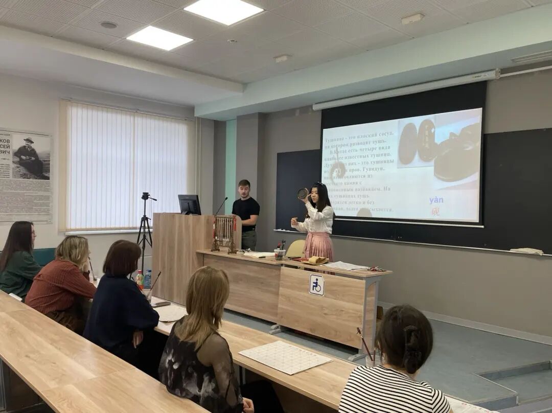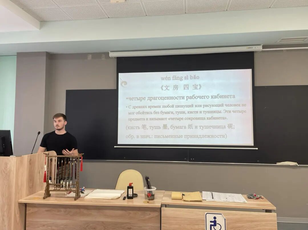 活动伊始,刘平老师从历史和功能两个角度,阐释了“文房四宝”在书法创作中的重要作用,生动地介绍了笔、墨、纸、砚的演变历程及其文化内涵,同时东方学二年级学生阿列克谢(Гутов Алексей)结合自身学习书法的经历,分享了对中国书法的理解和感悟。通过师生协作的方式,在场学生对中国书法有了基本的认识和理解,也为接下来的实践环节奠定了初步基础。