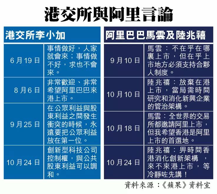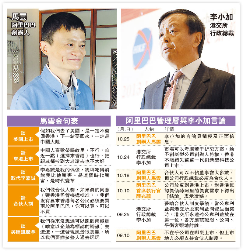 (2). 阿里巴巴港交所上市遇阻:2013年9月26日,李小加在港交所网站发表文章《投资者保障杂谈》,间接回应了阿里巴巴要求合伙人制(同股不同权)的特殊待遇在港上市遭遇大辩论一事。李小加在博文中,假借做梦扮演6重人格,让传统、创新、披露、程序、道德等要素化身脑内小人进行冲突对话。2014年4月,在阿里巴巴选择赴美上市后,李小加支持改革香港现有上市规则,并对香港承诺的“同股同权”原则表示质疑。