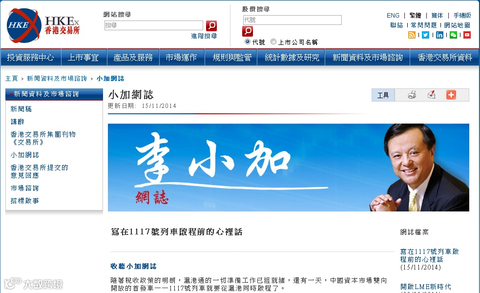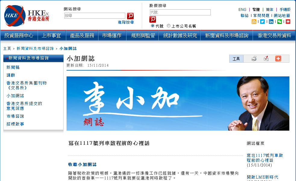香港交易及结算所有限公司(通称香港交易所,简称港交所)行政总裁李小加(Charles Li)在他于港交所网站的“小加网志”专栏发表的文章《写在沪港通1117号列车启程前的心里话》中说道:“中国资本市场双向开放的首发车——1117号列车就要从沪港同时启程了。作为这趟列车的筑路者之一,我的心中此刻百感交集,有激动,有期盼,也有紧张,有忐忑……(我们应该问的)正确的问题应该是,“有了沪港通是否比没有沪港通更好?”无论对香港还是上海,答案都是肯定的。所以,与其纠结于对谁更好,我们更应该着眼于是否能够双赢。更何况,沪港通的真正意义并不在于沪港两地存量上的重新分配,而是在于通过市场的融合与碰撞、把目前还未进入资本市场的巨額增量引入到两地资本市场…”