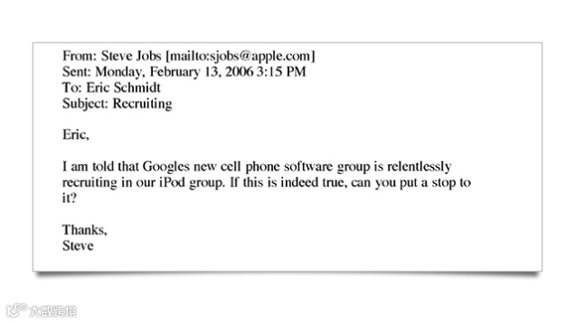 同样也是在2007年,乔布斯向谷歌的CEO Eric Schmidt写邮件,声称“I would be extremely pleased if Google would stop doing this (Google’s efforts torecruit an Apple engineer)”。随后,Schmidt在谷歌内部传阅了该邮件,并写道 “I believe we have a policy of no recruiting from Apple and this is a directinbound request. Can you get this stopped and let me know why this is happening? I will need to send a response back to Apple quickly so please letme know as soon as you can.” 后来,当乔布斯得知那个代表谷歌联系苹果公司员工的猎头会被谷歌立即解雇时(fired within the hour),乔布斯向Schmidt回了一封只有一个微笑表情的邮件。该集体诉讼于2014年5月达成了和解,苹果和其他几家高科技公司同意支付3亿2千400万美元的赔偿。这一次,美国司法部仍然没有对乔布斯或者其他硅谷高科技企业的明星高管们提起刑事控告。