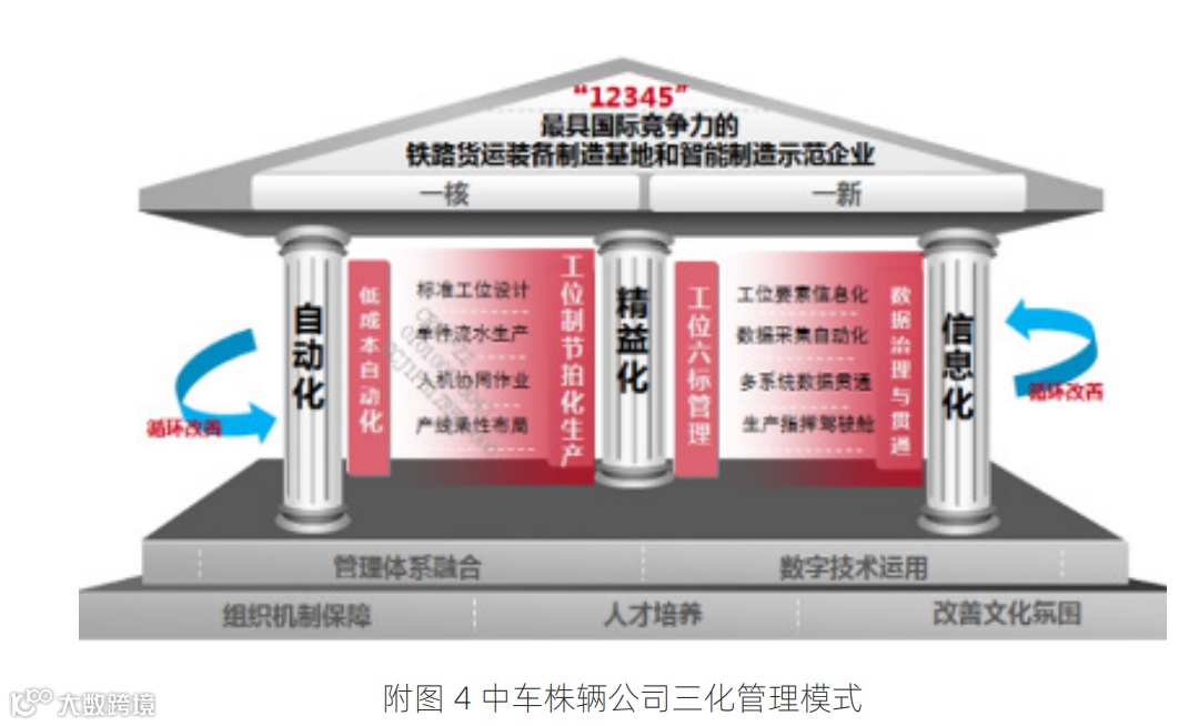 中车株洲车辆有限公司形成了从精益管理、自动化改造到信息化集成的全面 升级路径。首先在“精益化”方面,遵循“6621”精益管理理念,优化资源配置 与流程,建设标准工位 “六标” (工位管理、作业指导、标准化培训、配送、操作、 监督)管理模式。其次在“自动化”方面,通过机械手、RGV 和输送线等技术实 现生产线自动化,如车轴节拍化生产线利用机械手连接数控设备,实现多规格车 轴共线生产和“一人双机”模式。最后在“信息化”方面,注重数据的治理、整 合与应用,利用数据驱动生产,通过构建轨道车辆节拍化生产运营管理平台,增 强生产与管理的互联互通,实现数据一体化与管控精准化。