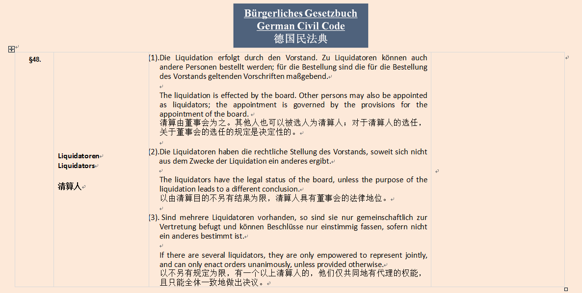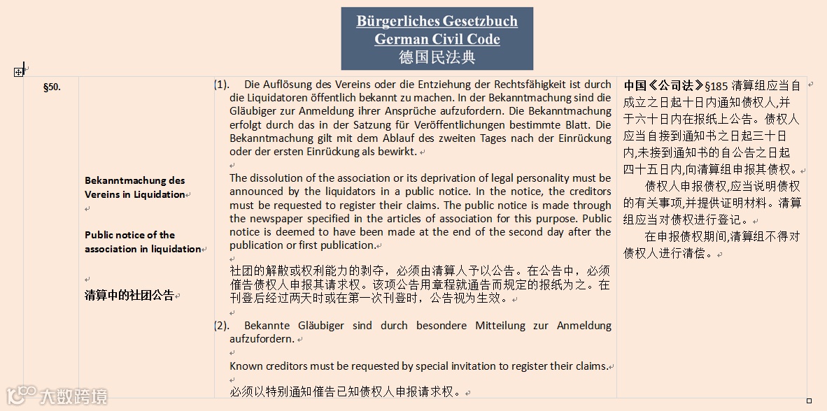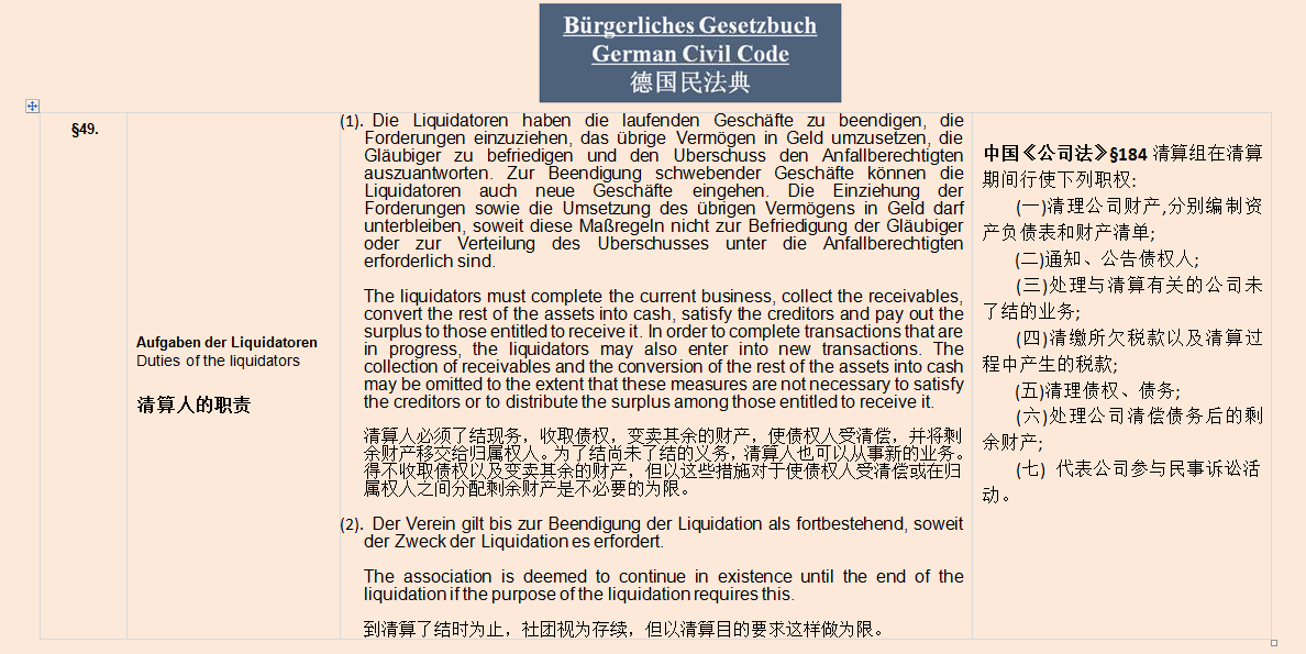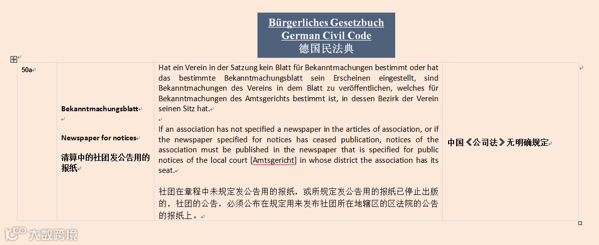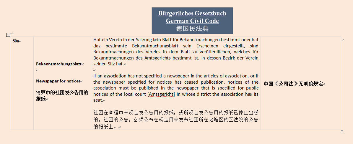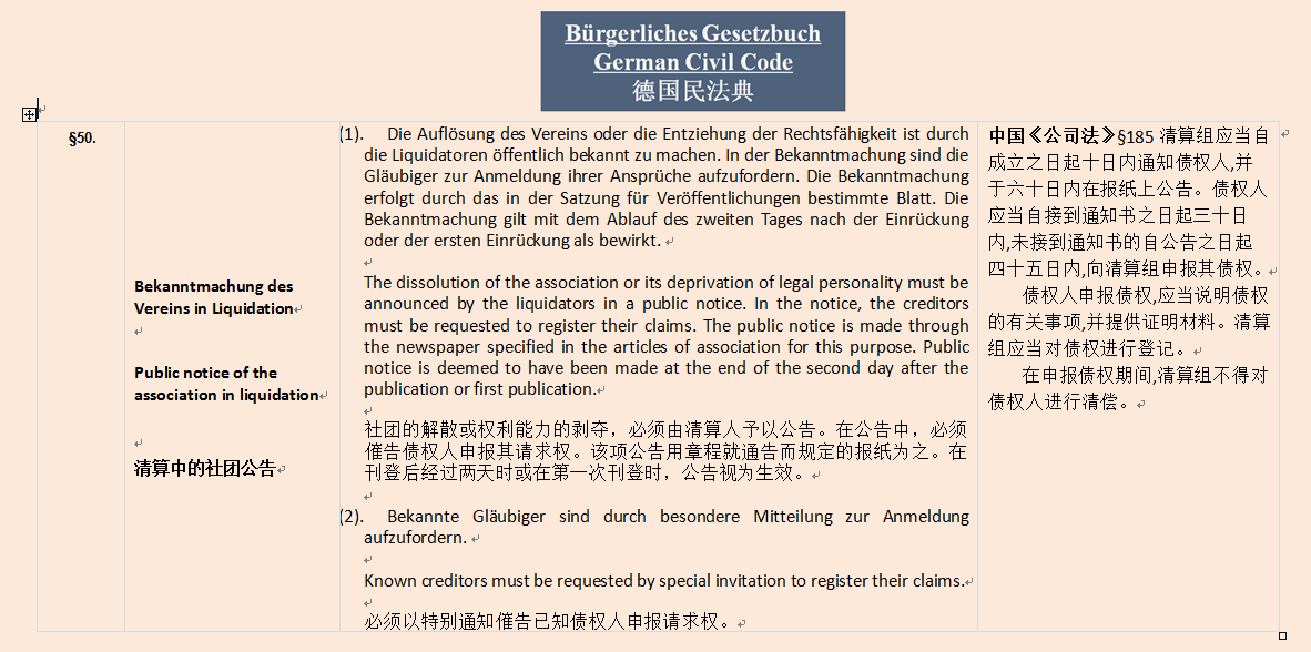 今天我们给大家带来的是德国民法典第48条清算人,第49条清算人的职责,第50条清算中的社团公告,第50a条清算中的社团发公告用的报纸。由于我国《民法通则》对此未作详细规定,我们尝试比较了中国公司法的相关规定。请点击下文图片放大阅读。