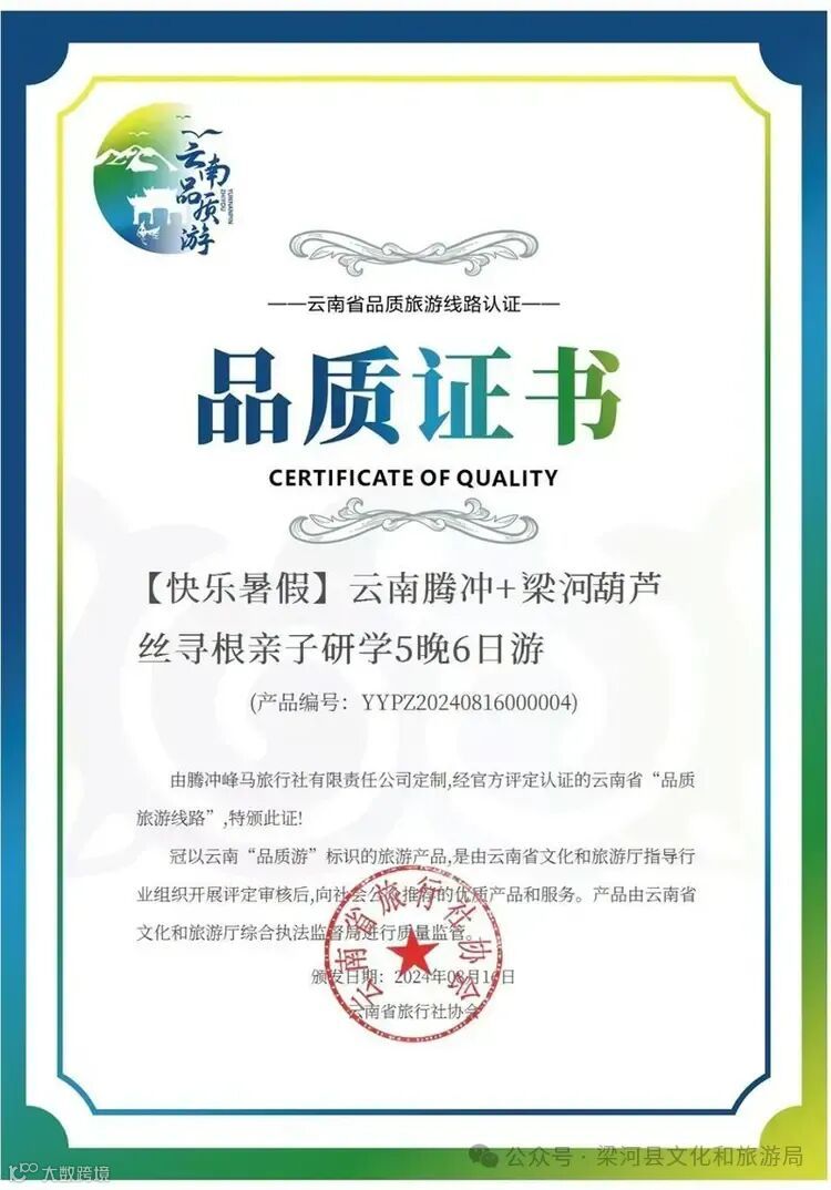 该线路由腾冲峰马旅行社有限责任公司定制,经官方评定认证为云南省品质游线路。冠以“云南品质游”标识的旅游产品,是由云南省文化和旅游厅指导行业组织开展评定审核后,向社会公众推荐的优质产品和服务。产品由云南省文化和旅游厅综合执法监督局进行质量监管。
