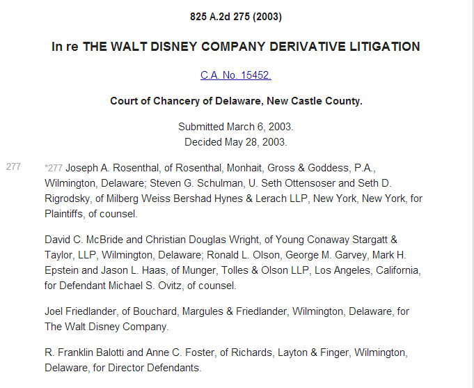 案件概况:1995年8月,奥维茨和迪斯尼公司签署了一份雇佣合同,合同约定,奥维茨将担任迪斯尼董事长5年。1996年的12月,上任仅14月后,迪斯尼解除了与奥维茨的合同,并向其支付了约1.3亿美元的违约赔偿。迪斯尼的几名股东随即代表公司向特拉华衡平法院提起股东派生诉讼,主张公司董事会在雇用和解雇奥维茨事件上行事过于草率,违反了信用义务,并要求他们为此支付高达2.62亿美元的赔偿金。原告第一次起诉被特拉华衡平法院驳回.原告上诉后,特拉华高级法院将案件发回重审。2005年8月,特拉华衡平法院判决原告败诉。原告再次上诉。2006年6月9日,特拉华高级法院终审维持原判。参见迪斯尼公司派生诉讼案(In re Walt Disney Company Derivative Litigation.WL 1562466.Del.Supr.2006)。