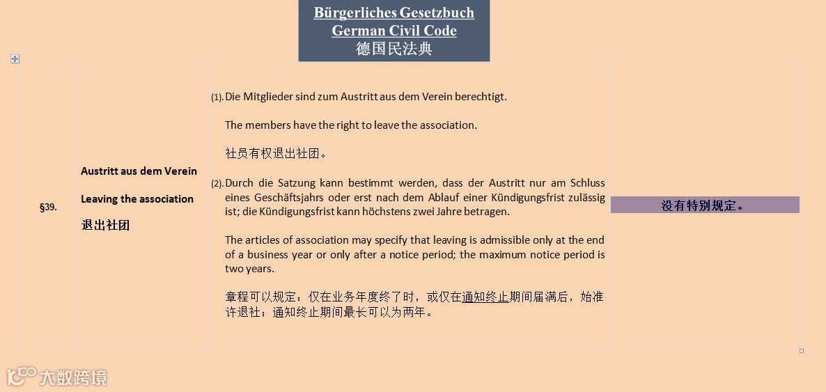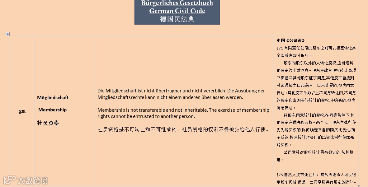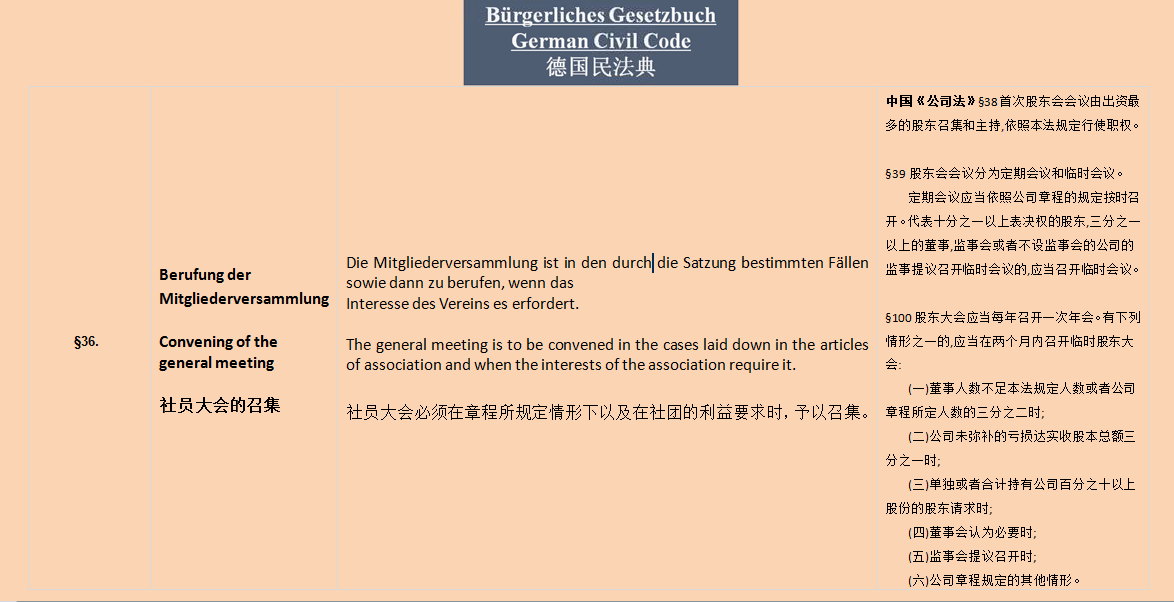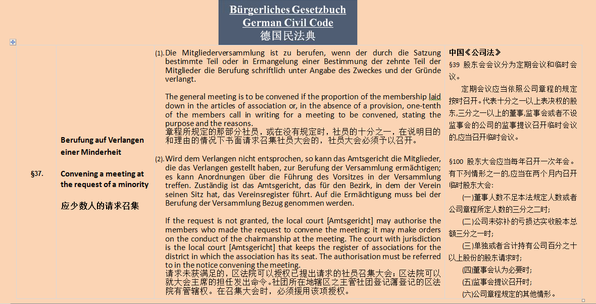 今天给大家带来的是德国民法典第36条社员大会的召集,第37条应少数人的请求召集,第38条社员资格,第39条退出社团。由于我国《民法通则》对此未作详细规定,我们尝试比较了中国公司法的相关规定。请点击下文图片放大阅读。