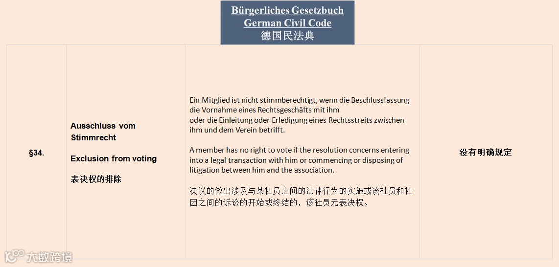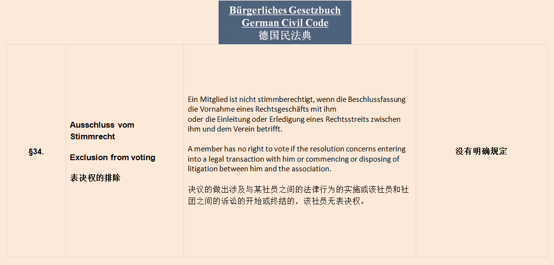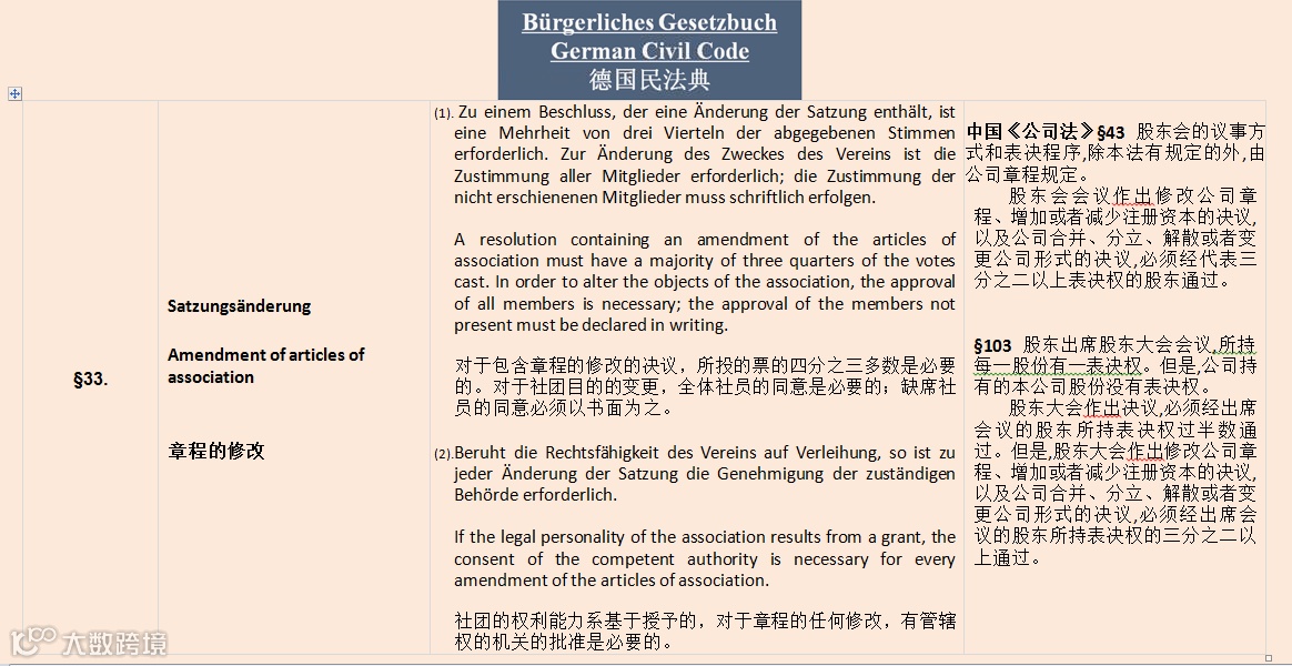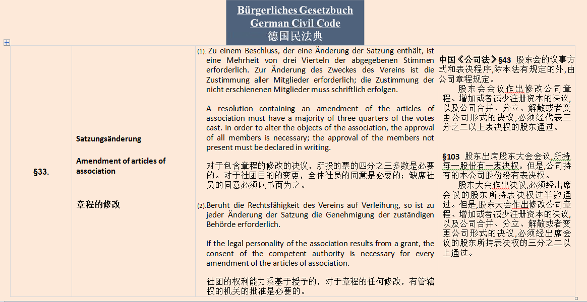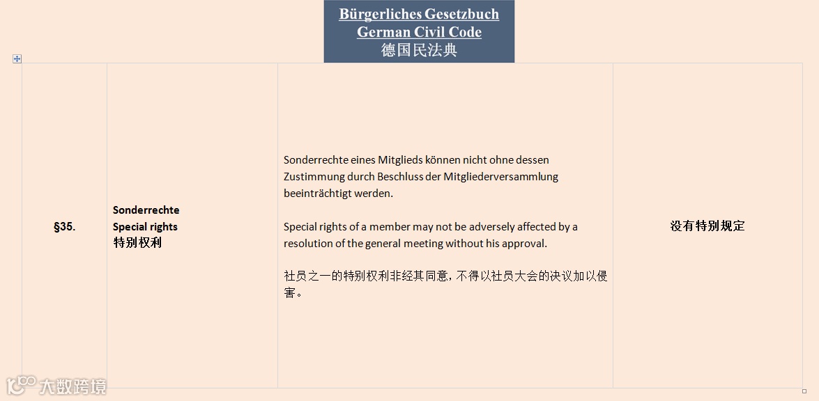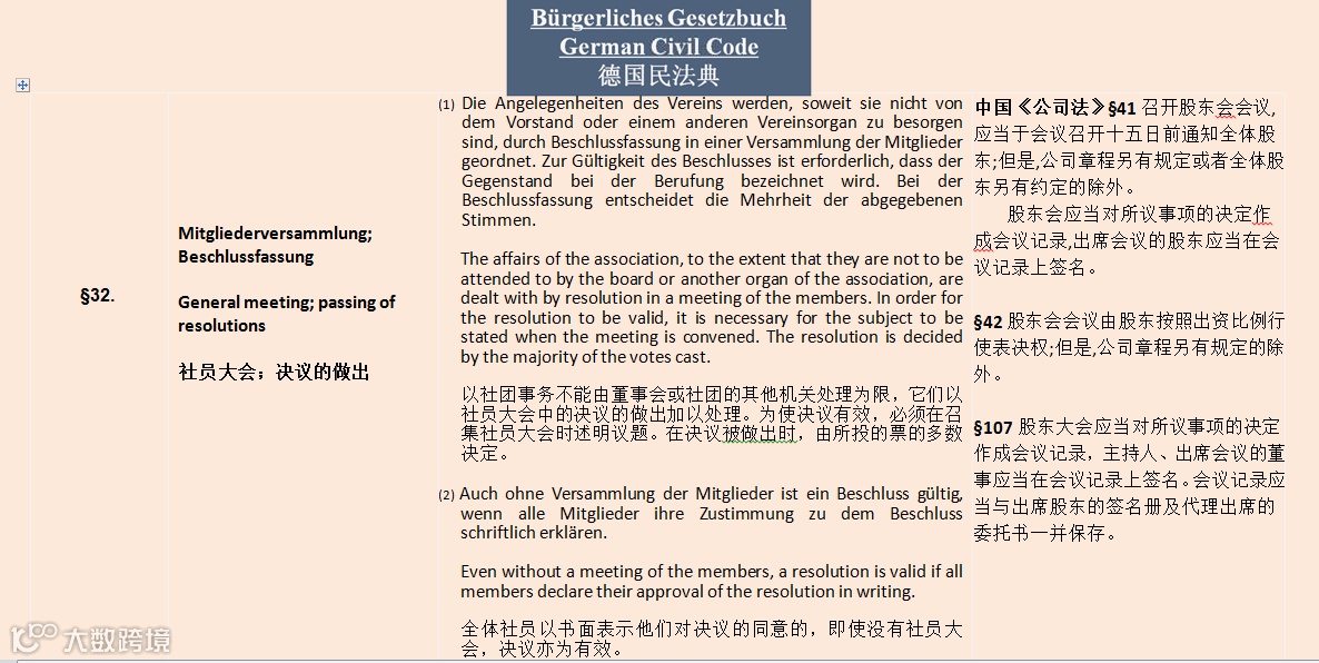 今天给大家带来的是德国民法典第32条社员大会;决议的做出,第33条章程的修改,第34条表决权的排除,第35条特别权利。由于我国《民法通则》对此未作详细规定,我们着重比较了中国公司法的规定。请点击下文图片放大阅读。