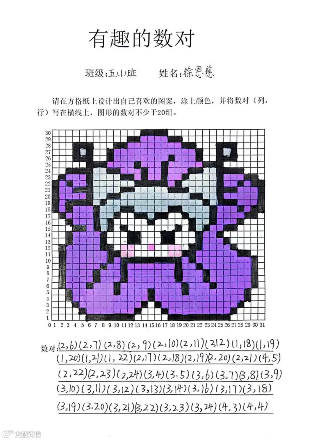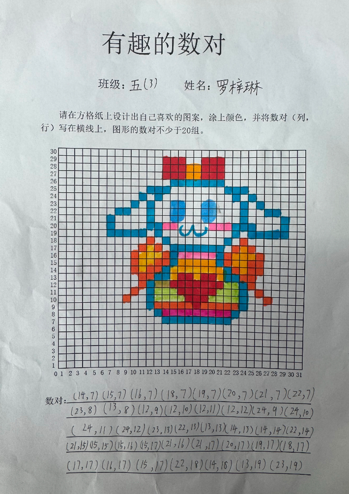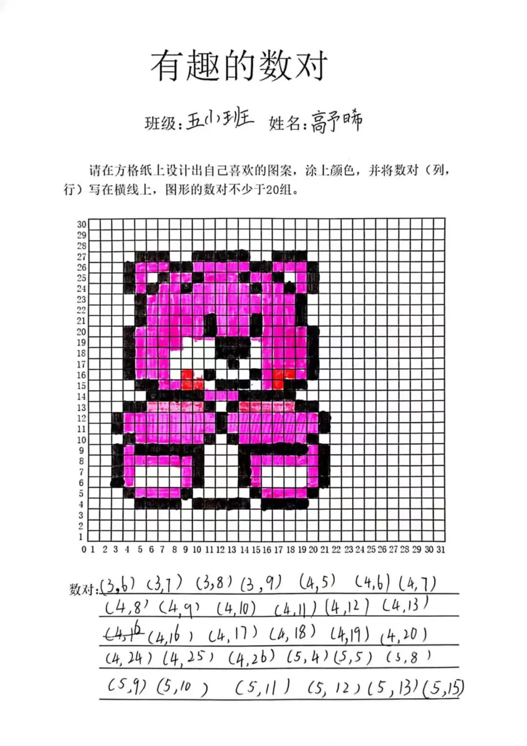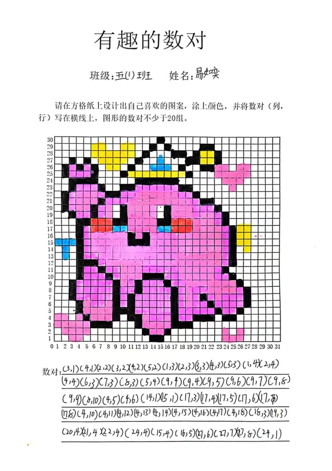When mathematics meets art, use "number pairs" as your creative password. Accurately locate on the grid paper, draw unique patterns, and unlock the gorgeous world hidden in the coordinates. Starting from the intersection of the horizontal axis and the vertical axis, each number pair is like a key, leading you to open the door of spatial thinking. Imagine yourself as a little explorer, holding a coordinate map, looking for treasures between the grids —— maybe a shining star, maybe a blooming flower, or even the abbreviation of your name!