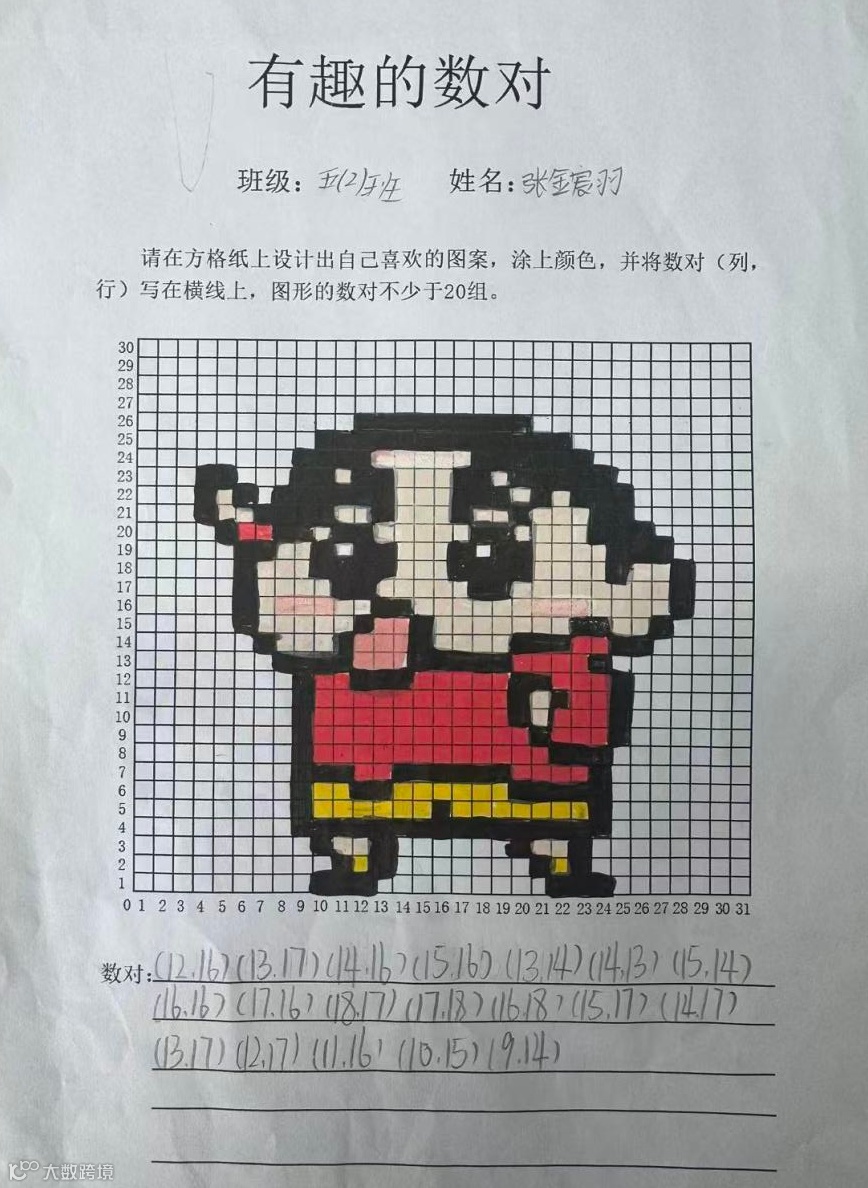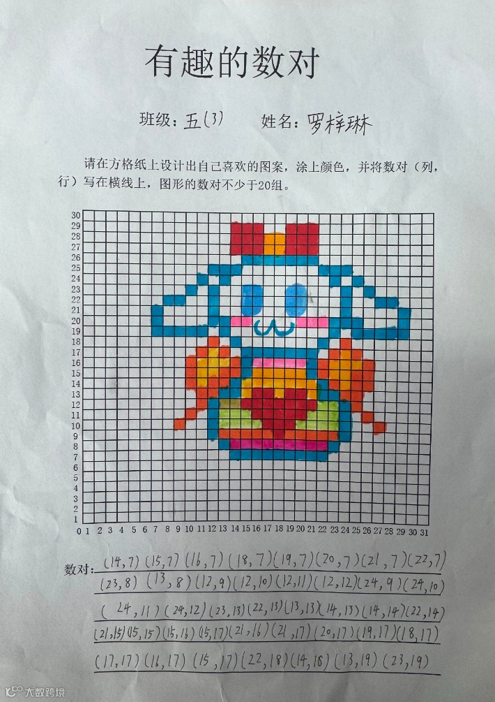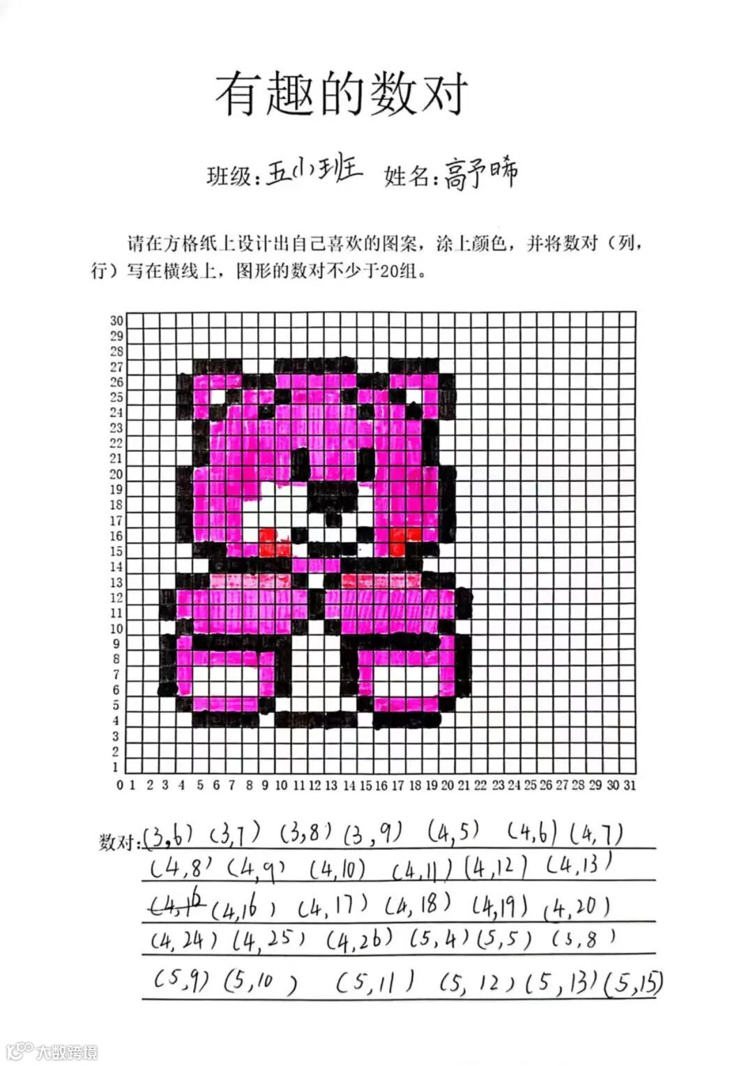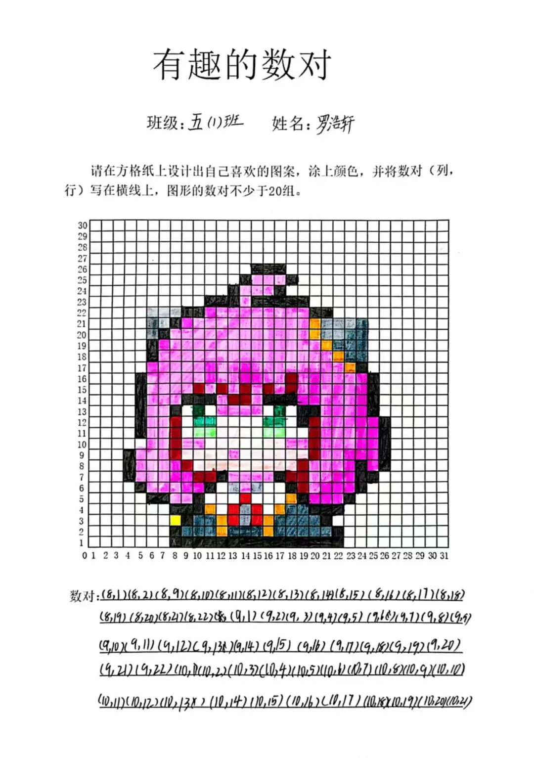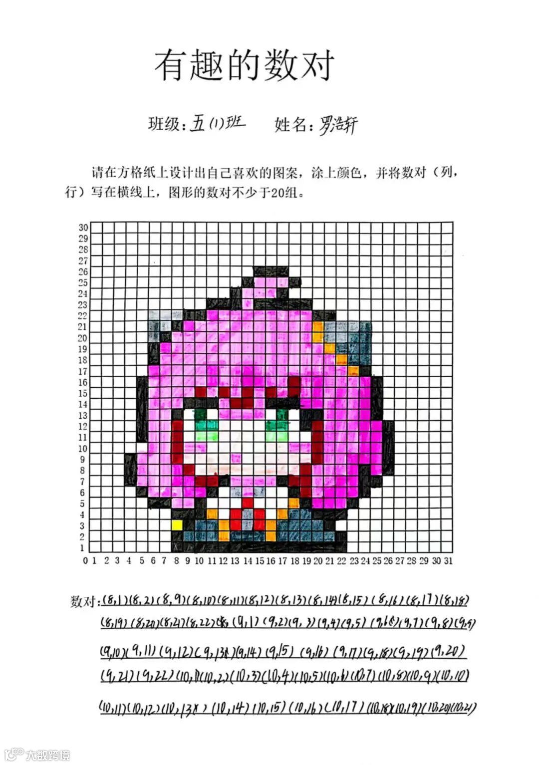 当数学遇见艺术,用“数对”作为你的创意密码。在方格纸上精准定位,绘制独一无二的图案,解锁隐藏在坐标里的绚丽世界。从横轴与纵轴的交点出发,每一个数对都像是一把钥匙,带你打开空间思维的大门。想象自己是一名小小探险家,手握坐标地图,在方格间寻找宝藏——也许是颗闪闪发光的星星,也许是朵绽放的花朵,甚至是你的名字缩写!