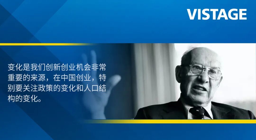 德鲁克说我们要永远走在变化的前面。变化是我们创新创业机会非常重要的来源,在中国创业,特别要关注政策的变化和人口结构的变化。特别是在后疫情时代,外部环境发生了很大变化,每个人都可能面临失业的挑战,在这种情况下更应该鼓励员工成为创业者。