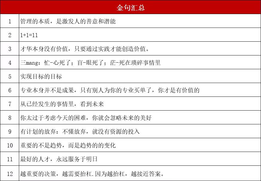 另附《卓有成效的管理者》课程中的部分经典语录,希望能给各位读者,也能从中找到些许对管理的共鸣或启发。