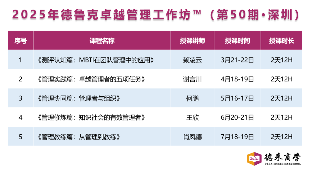 本课程依据德鲁克经典管理思想,围绕管理者的五项工作,结合老师十几年的管理实践所设计的管理课程,不仅帮助管理者打通了心智和认知,而且帮助管理者接受训练后能够知行合一,由内而外的提升管理技能。