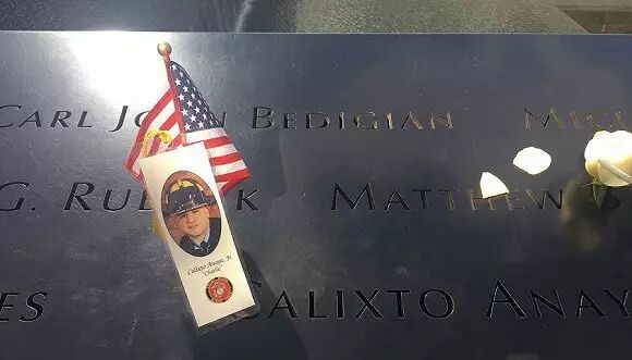 除了国家纪念博物馆,纽约的年度纪念活动还在9·11遗址以及现在的纪念公园举行。当年的双子楼遗址现在是两个方形纪念水池,周围石板上镌刻了近3000名罹难者的姓名。遇难者亲属驻足在亲人名字前,有的带来鲜花,有的带来国旗,有的默默哀悼,还有的贴上了逝者生前的照片。