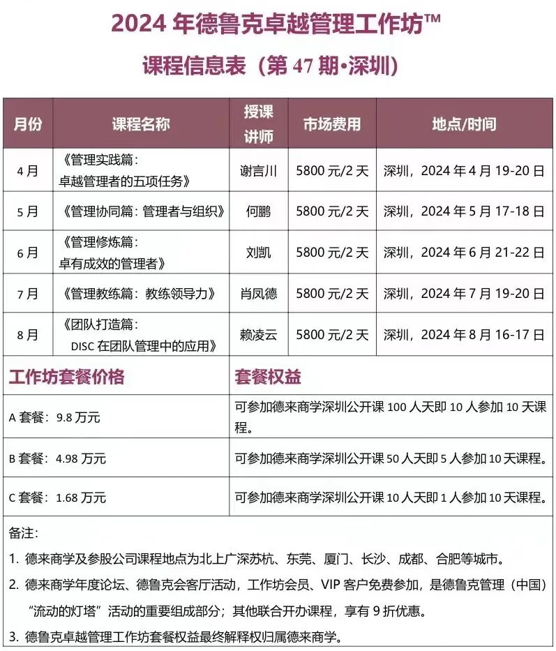 萃取德鲁克先生同名著作精华,切合中国管理者的实际情况,采用互动、启发式案例教学。