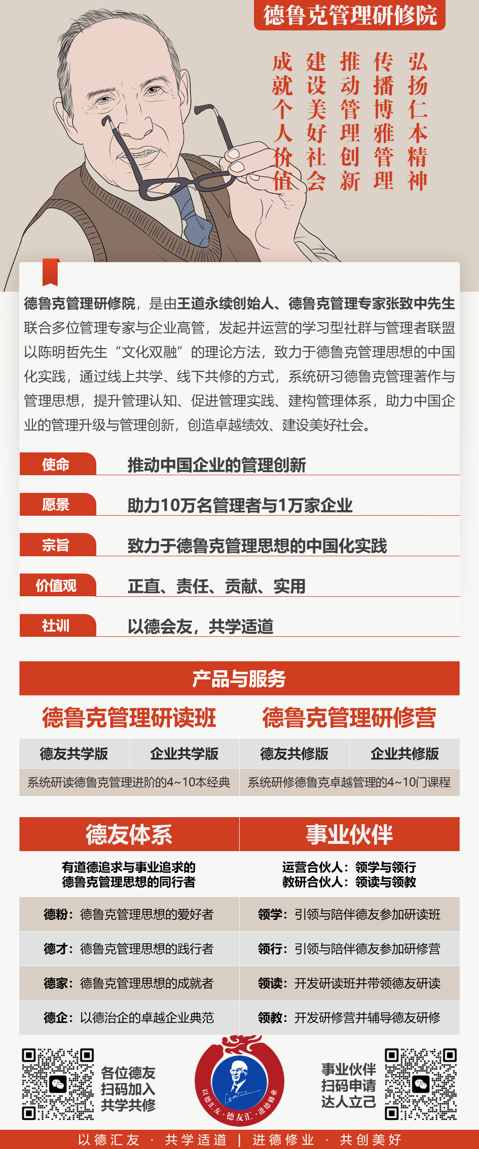 不管你是上了年纪的企业主,却还没有时间了解德鲁克学的魅力;或你是刚就业的白领新鲜族;或你要为你17岁的儿女们做些什么事;都可以从“阅读德鲁克”、“践行德鲁克”下手。