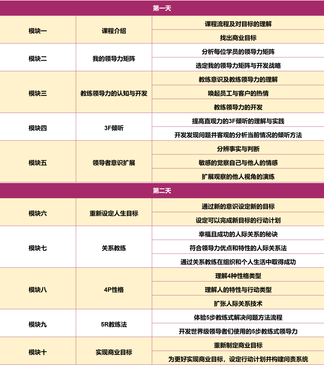 · 《教练领导力》课程:让管理者(领导)成为教练,实现更高组织绩效;