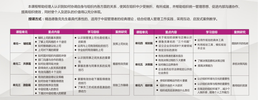 · 技术创新:不仅有德鲁克3个经典课程,在工作坊里引入了测评、行动学习和教练技术,构建了从认知到落地学习的闭环,同时线上线下课程相结合;