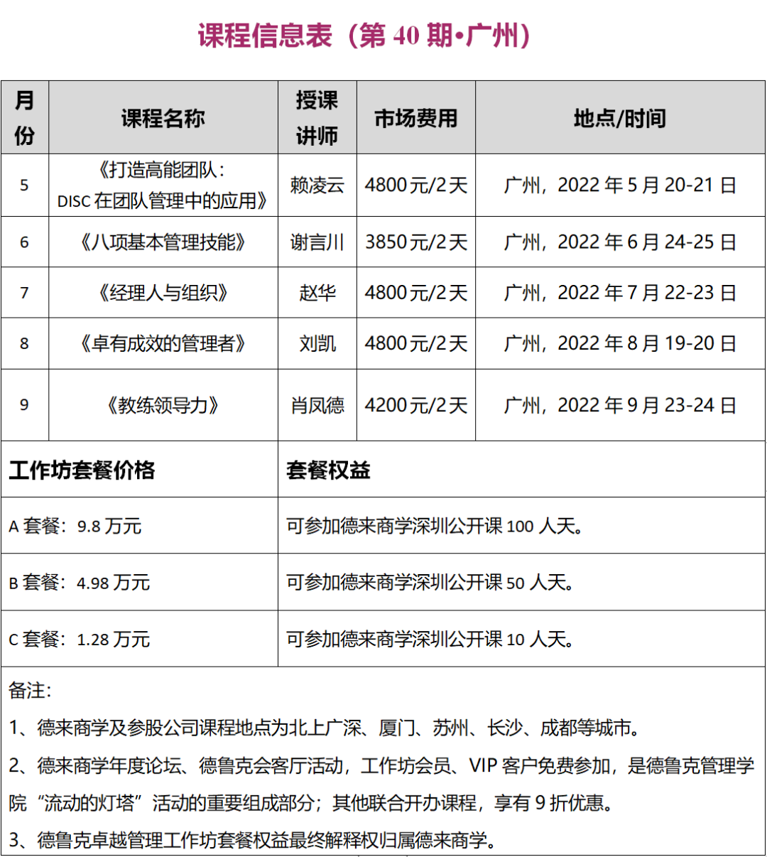 精选5门管理课程,10天系统学习,半天德来商学论坛或茶话会,时间跨度5个月,每月安排2天集中授课。