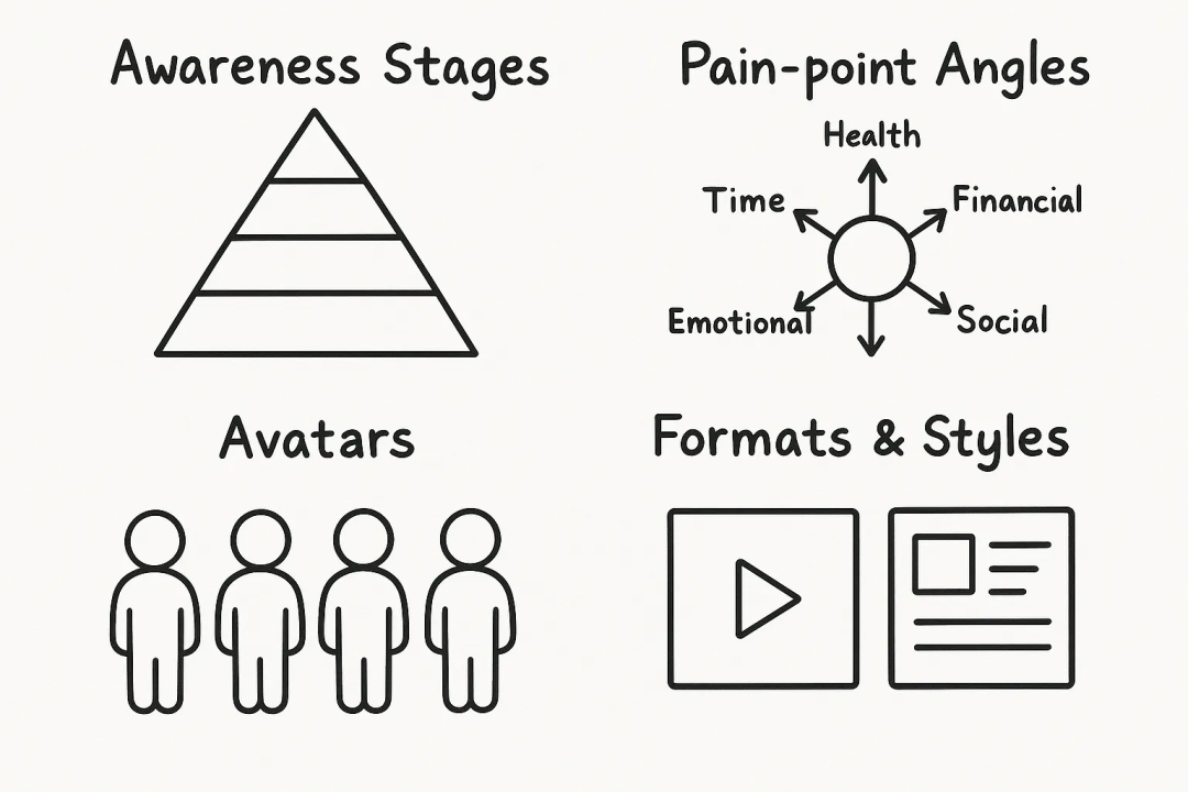 - 问题察觉(Problem Aware)/ 受挫者: 专注于引起共鸣、使用 PAS(问题-激化-解决)框架或前后对比。