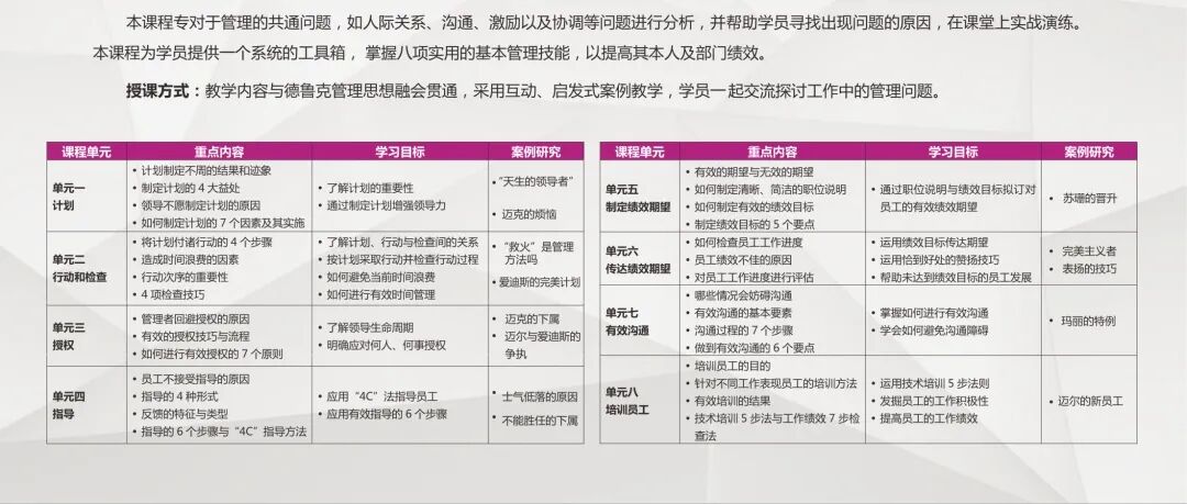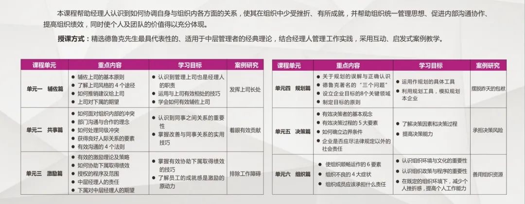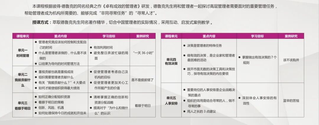 · 技术创新:不仅有德鲁克3个经典课程,在工作坊里引入了测评、行动学习和教练技术,构建了从认知到落地学习的闭环,同时线上线下课程相结合;
