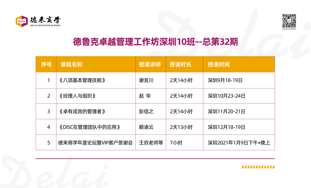 精选4门管理课程,8天系统学习,半天德来商学年度论坛,时间跨度5个月,每月安排2天集中授课。