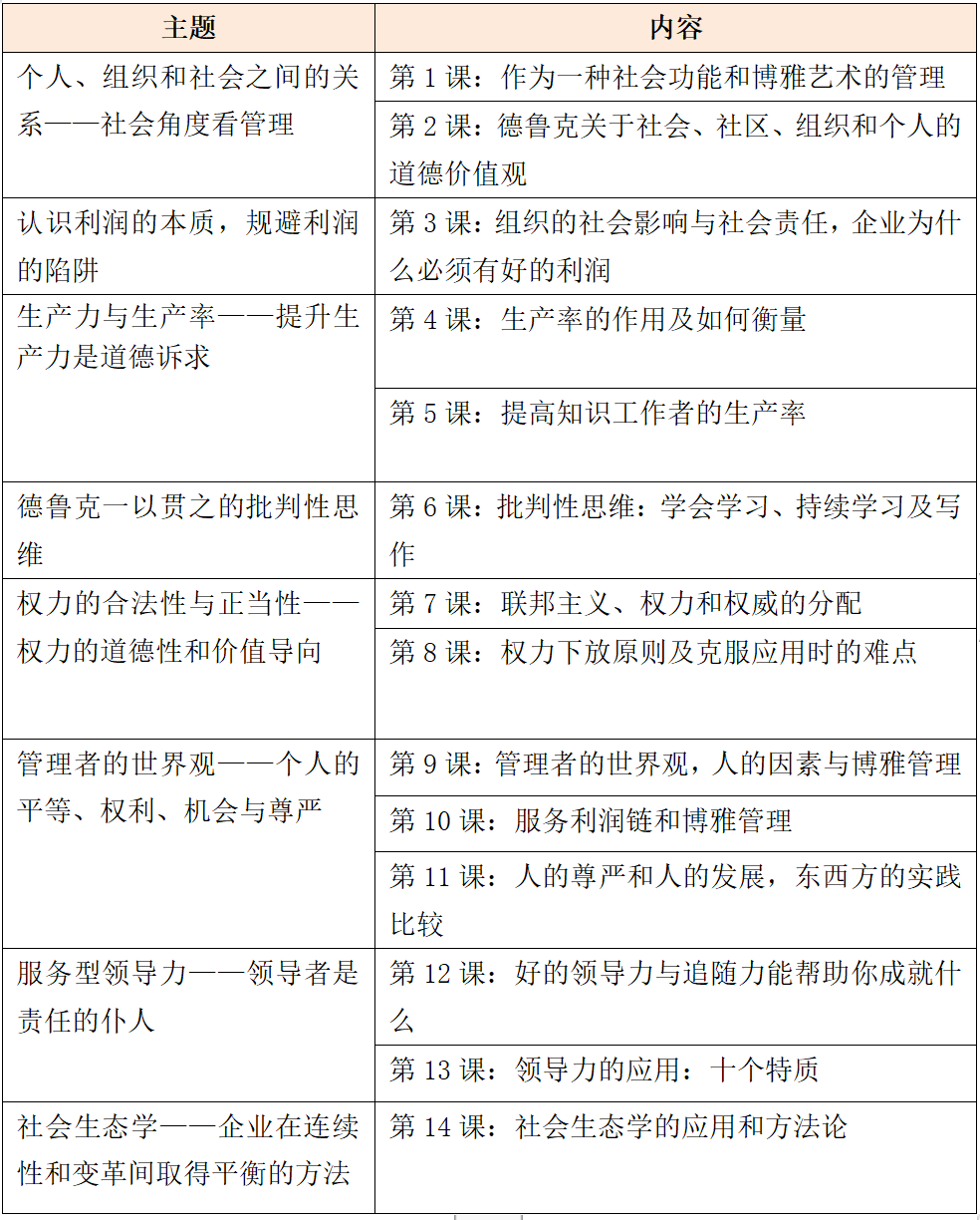 · 课程研发和讲授:约瑟夫·马恰列洛(Joseph A. Maciariello)教授,德鲁克好友及同事,著有《德鲁克管理日志》、《卓有成效管理者的实践》、《管理(修订版)》、《失落的管理艺术》,被德鲁克认为“比我自己更熟悉我的著作”的著名管理学者,研究、教授德鲁克思想三十多年。