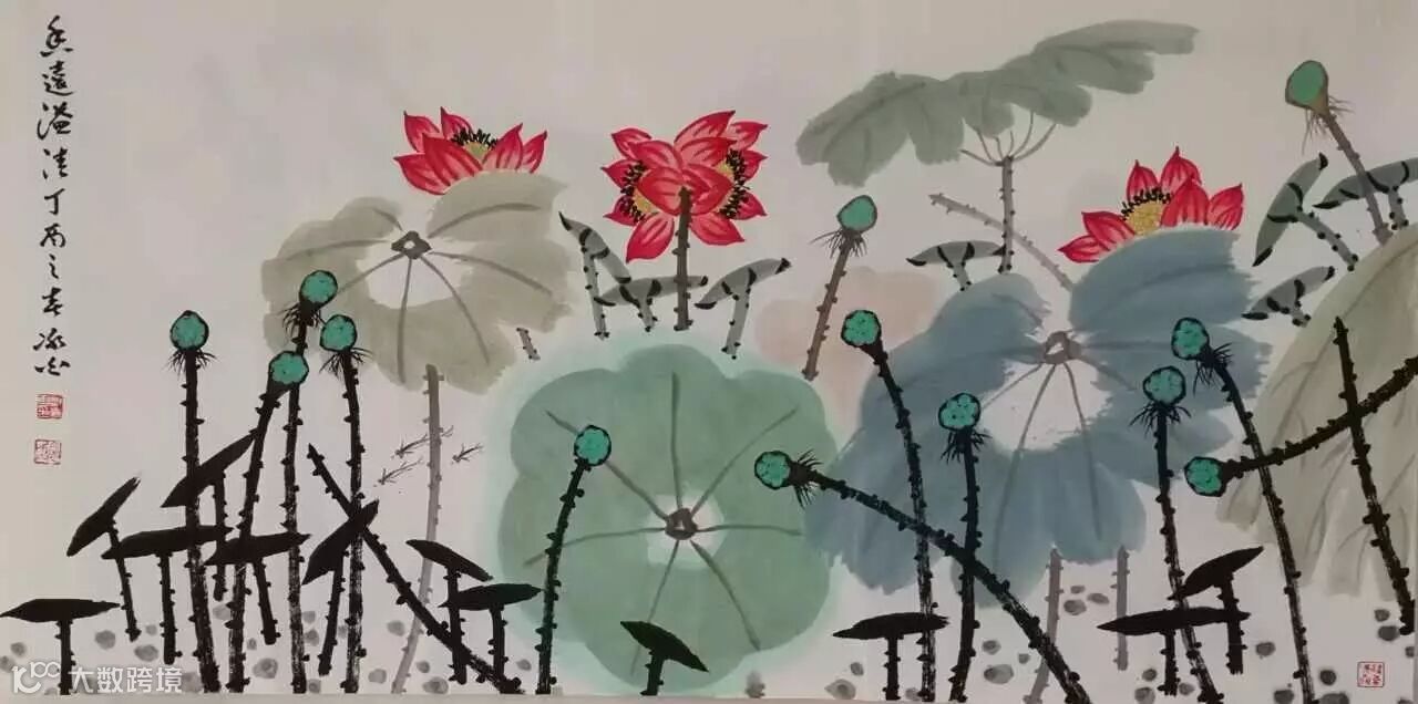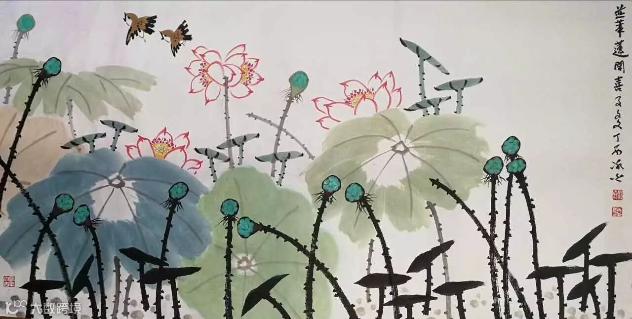 郭嘉自幼喜爱书画,精篆刻,擅画荷。二十多年来潜心研习吴昌硕、齐白石、张大千等大师的荷花及花卉。其作品构图布局十分考究,叠而不乱,满而不板,实中有虚,其用金石笔法入画,行笔爽利峻拔,力能扛鼎,柔里含刚。利用色彩的不同变化,把画面层次充分表现出来,纵横交错的莲蓬杆枝笔笔有力,杆与花朵安排十分巧妙,处处有笔意,诗意盎然。画面色彩绚丽,清新典雅,令人心旷神怡。