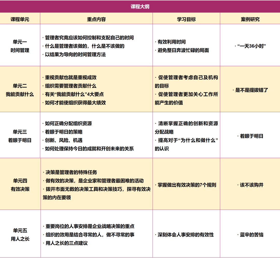 萃取德鲁克先生同名著作精华,切合中国管理者的实际情况,采用互动、启发式案例教学。
