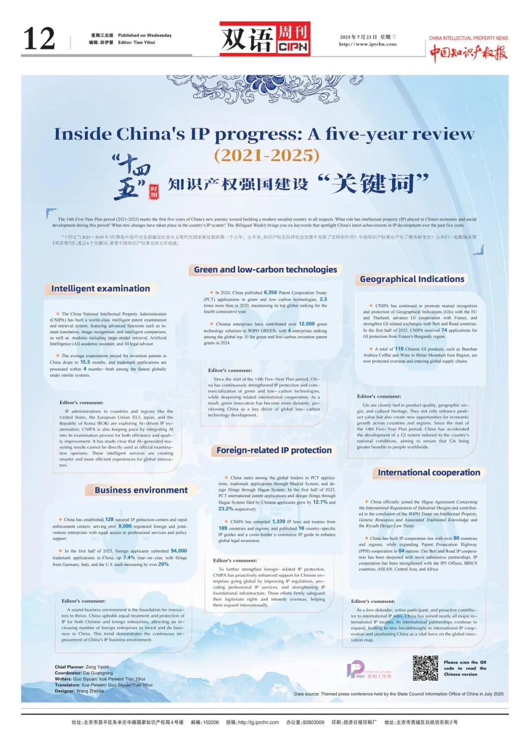 The 14th Five-Year Plan period (2021-2025) marks the first five years of China's new journey toward building a modern socialist country in all respects. What role has intellectual property (IP) played in China's economic and social development during this period? What new changes have taken place in the country's IP system? The Bilingual Weekly brings you six keywords that spotlight China's latest achievements in IP development over the past five years.