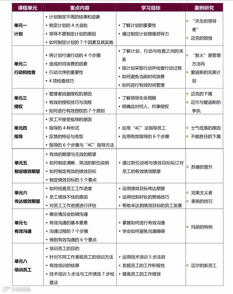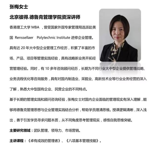 教学内容与德鲁克管理思想融会贯通,采用互动、启发式案例教学,学员一起交流探讨工作中的管理问题。