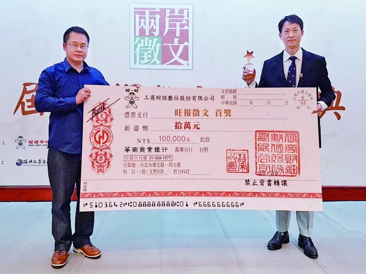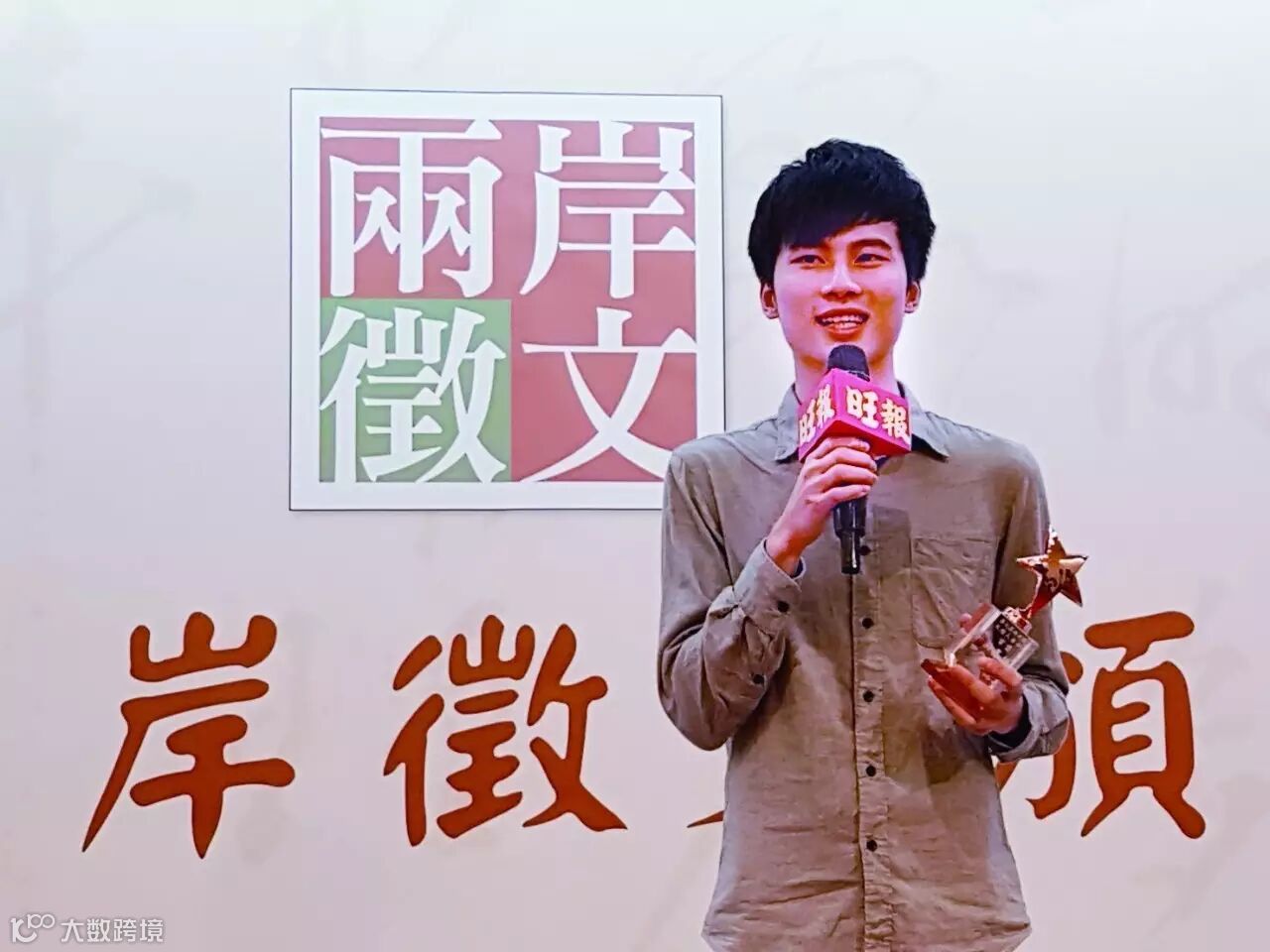 大陆组首奖得奖人王冠玺为浙江大学光华法学院教授,他以《父亲的眼泪,横跨整个中国》一文,细腻描绘在上海通勤时,在校车上看到一名来自新疆的父亲,因不舍儿子离开家乡,在上海交通大学读大学,送别时强忍悲伤的场景。其在浙江大学任教已14年,熟悉大陆及两岸事务,他认为两岸征文平台不只能让青年及学者畅所欲言,《旺报》作为专长报道海峡两岸新闻的媒体,也能充分提供知识,让两岸的青年学子互相交流与认识。