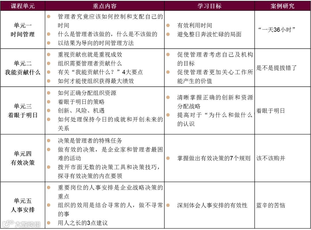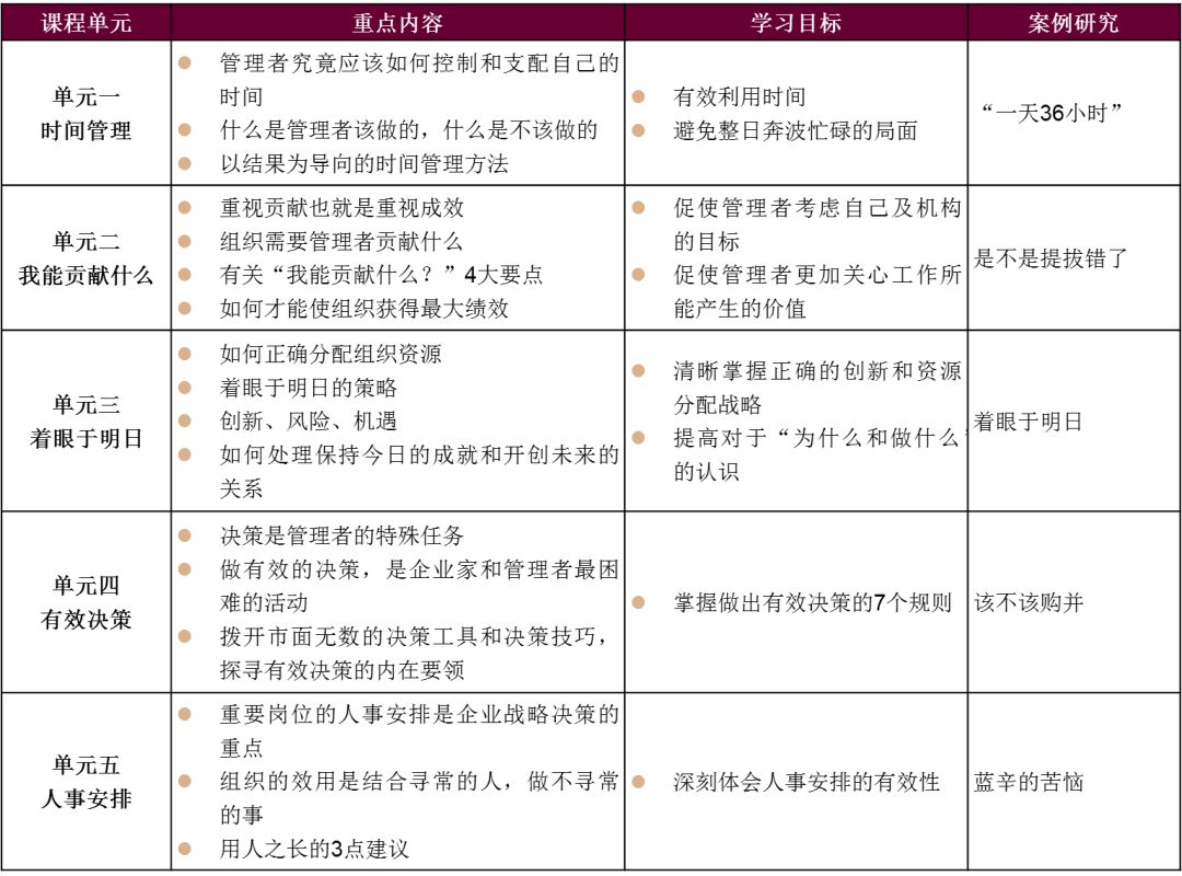 萃取德鲁克先生同名著作精华,切合中国管理者的实际情况,采用互动、启发式案例教学
