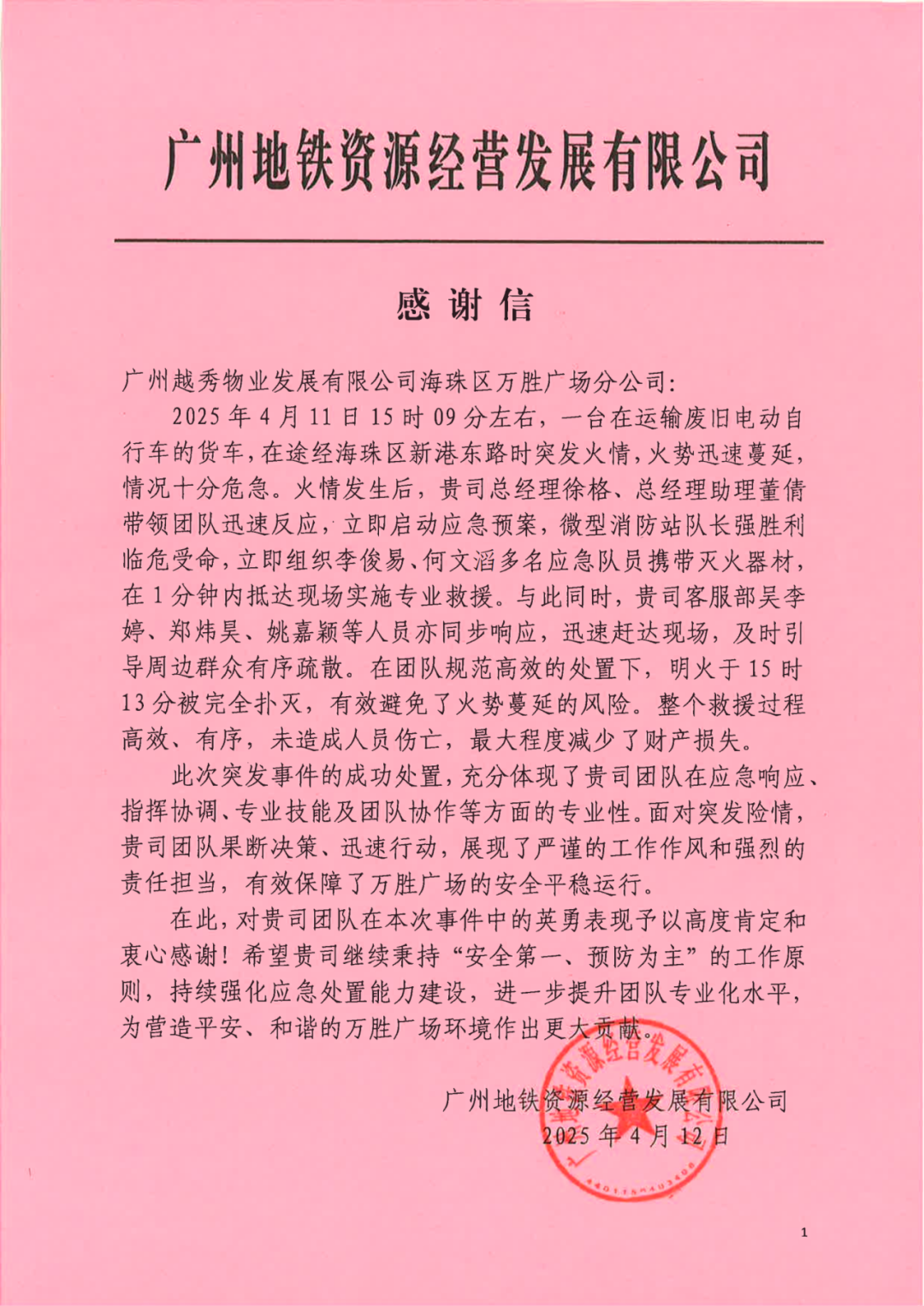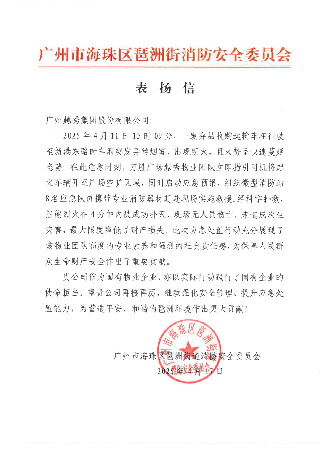 2025年4月11日15时09分,广州市海珠区新港东路,一辆货车在行驶中起火,司机紧急把车驶向万胜广场求助。万胜广场安管经理强胜利带领7名应急队员迅速响应,4分钟内成功扑灭明火,未造成人员伤亡。这场极速救援,是万胜广场安管团队无数次训练与实战的成果,更是团队“主心骨”——强胜利对越秀服务企业使命的深刻践行。