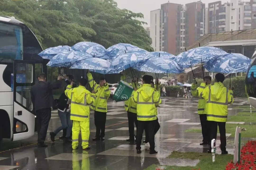 当参观团贵宾下车时,强胜利早已带领队员们严阵以待。他们手持暖心雨伞,连成一道“风雨连廊”,为宾客们遮挡风雨。细微之处尽显关怀,万胜安管团队严谨贴心的服务赢得了宾客们的一致赞誉,更展现了温暖的“越秀温度”。