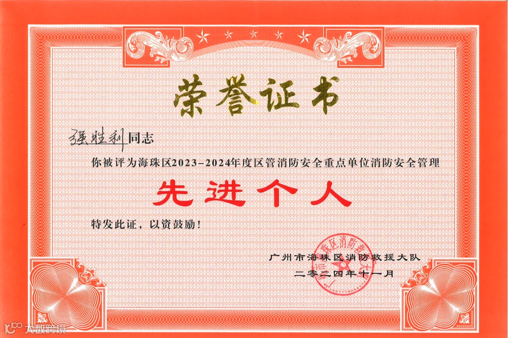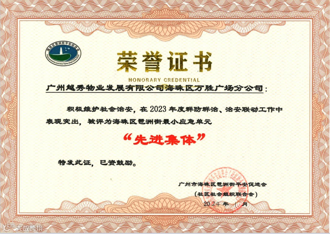 在强胜利的带领下,万胜广场安管团队连续5年荣获海珠区“消防先进单位”、“琶洲街道最小先进集体”,连续4年荣获“琶洲街道安监先进单位”。强胜利入职越秀以来,连续15年获评“优秀员工”称号,2024年获海珠区“消防先进个人”。这些荣誉不仅是对万胜安管团队的认可,更是对他们在维护社区安全、提升服务质量方面所作贡献的肯定。