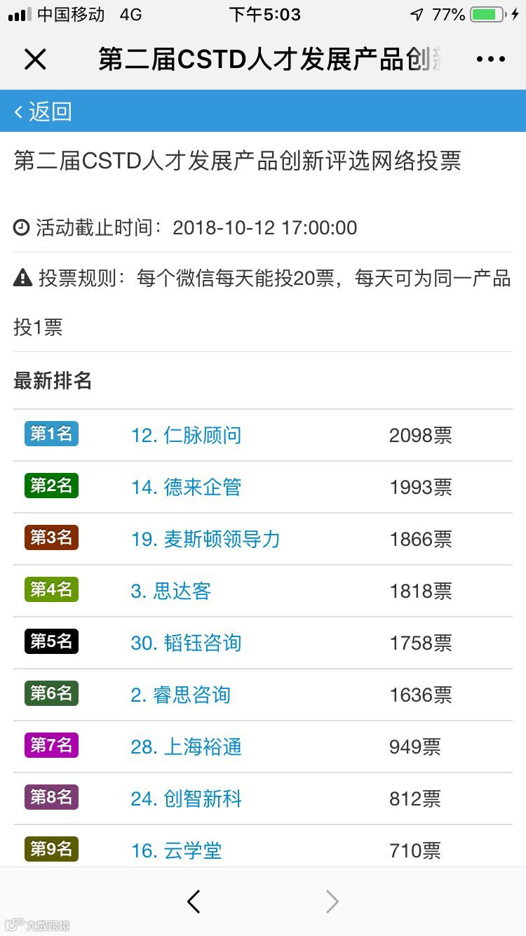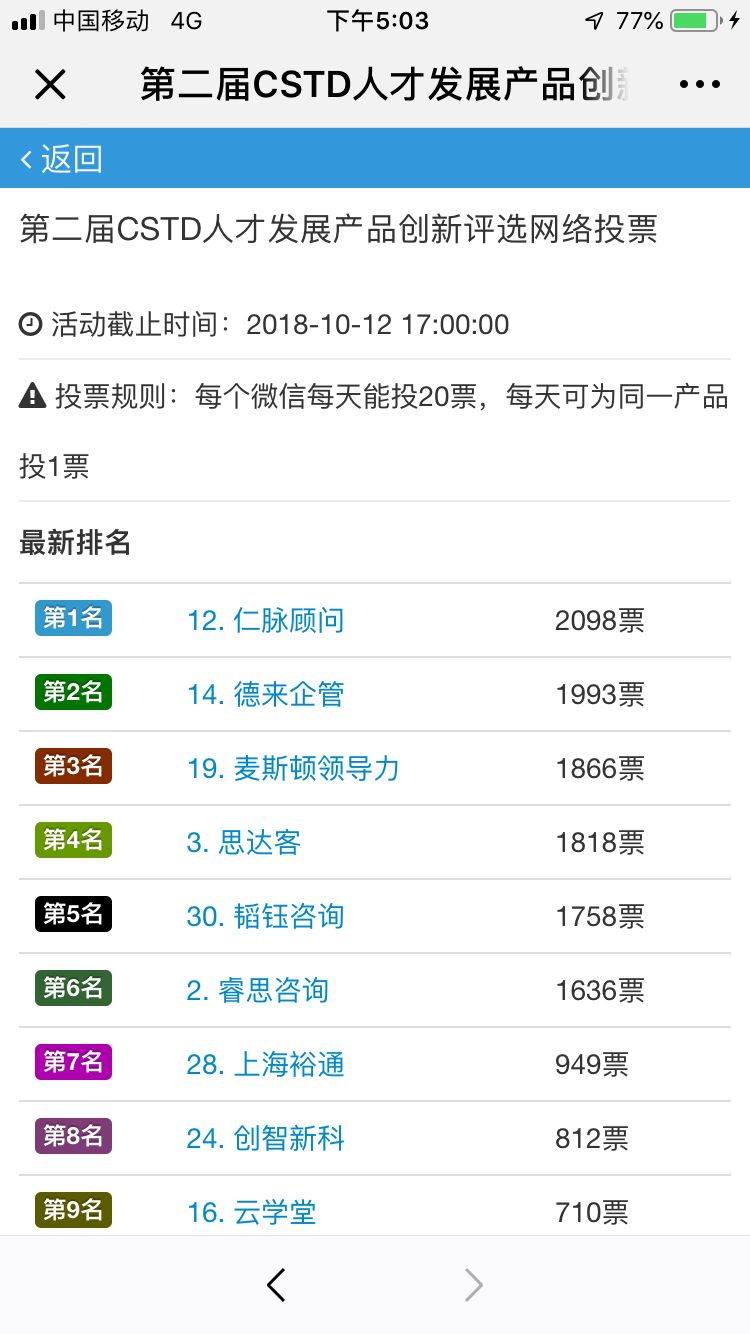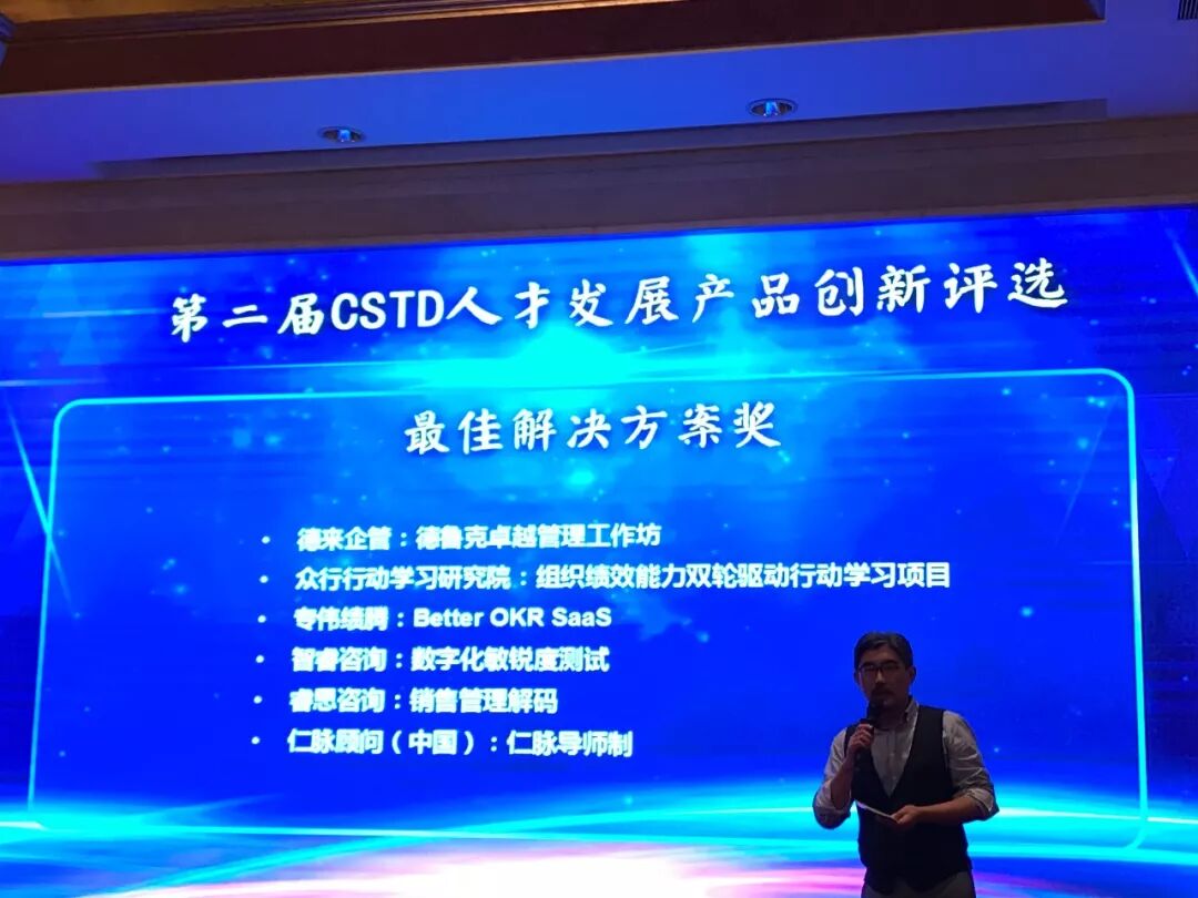 经过近两个月的初审,德鲁克卓越管理工作坊TM从众多产品中脱颖而出入围复赛,从产品功能属性、创新形式、市场表现和用户反馈等多维度进行展示。经过大众投票(以1993票高居第2名)、现场专家评审等环节,最终凭借创新的产品设计和卓越的市场表现,荣获2018年(第二届)CSTD中国人才发展“最佳解决方案”奖。