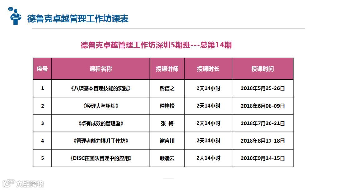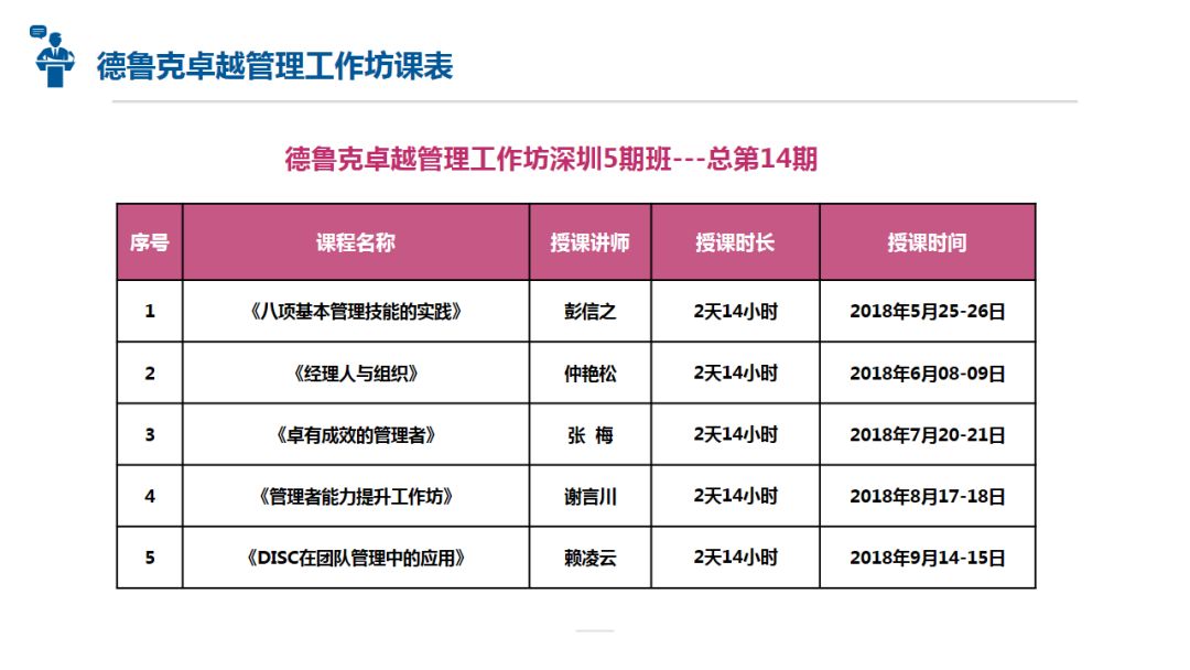 欢迎您能够拥抱德鲁克思想,走进将近5个月时间的《德鲁克卓越管理工作坊》学习之旅,显示了您积极开放的学习心态,彰显了您所在企业迈向管理高峰的决心。在这里请您暂时忘记您的工作、您的职位、您的年龄,重新做回一名纯粹的学生;在这里您将与大师的管理思想碰撞,与经验丰富的老师和学员共享正本清源的管理学盛宴;在这里因您的积极投入和精彩分享而让管理的智慧更加闪亮。