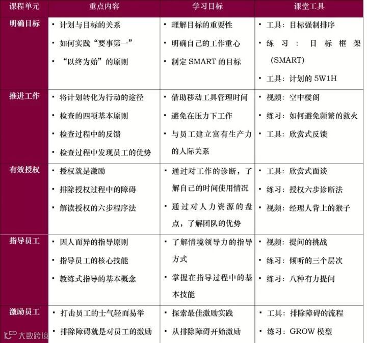 教学内容与德鲁克管理思想融会贯通,采用互动、演练、启发式教学,课堂70%的时间用于课堂教学活动的体验,全方位地覆盖了基层经理需要具备的管理技能,引导新经理在系统提升能力的过程中完成角色的转变。